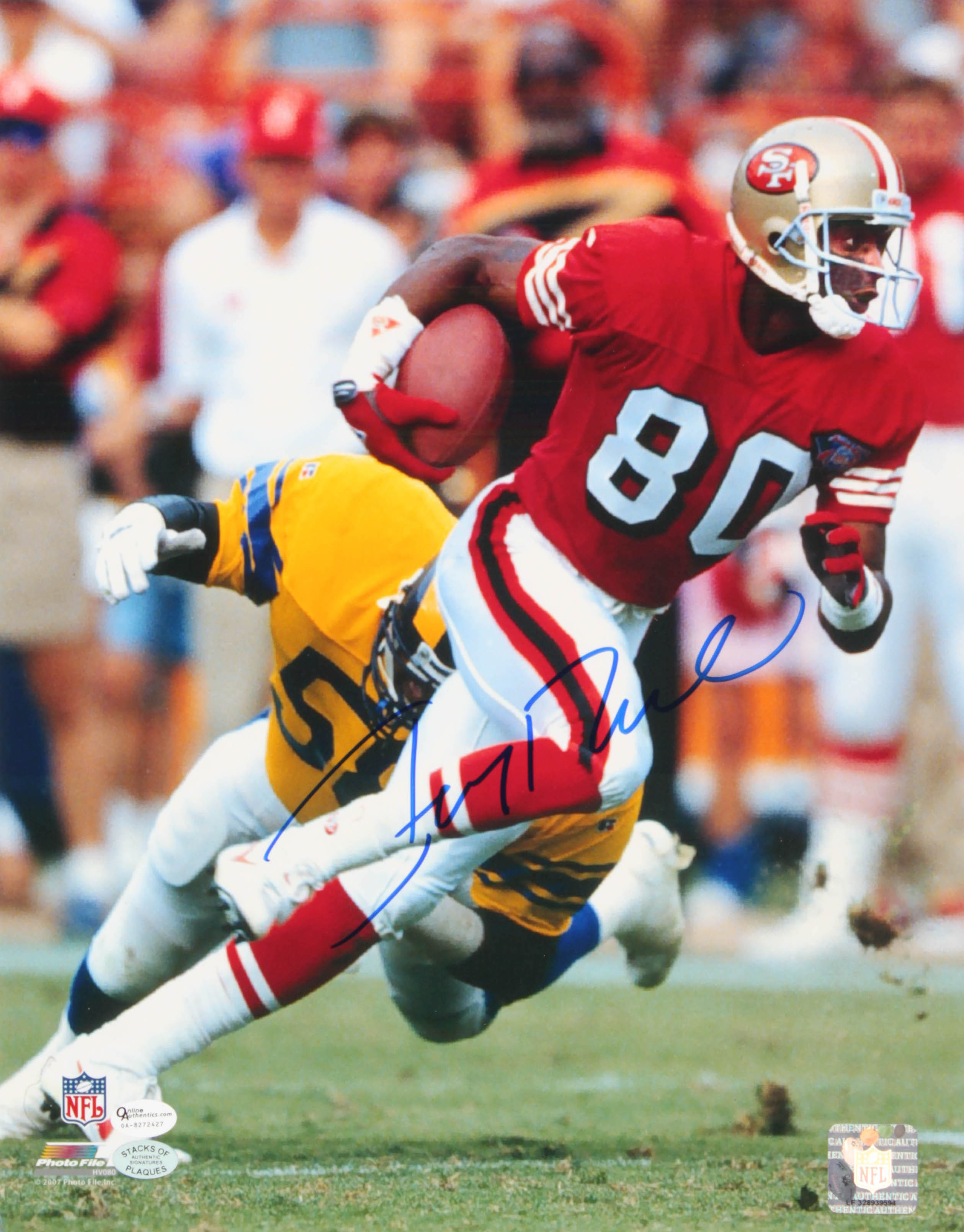 Photo measures 11" x 14" in size and has been hand-signed in blue felt-tip pen by Jerry Rice (San Francisco 49ers, HOF).