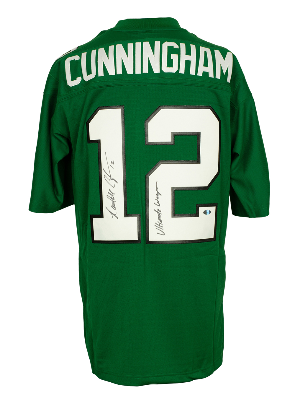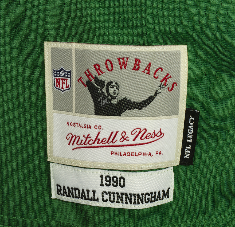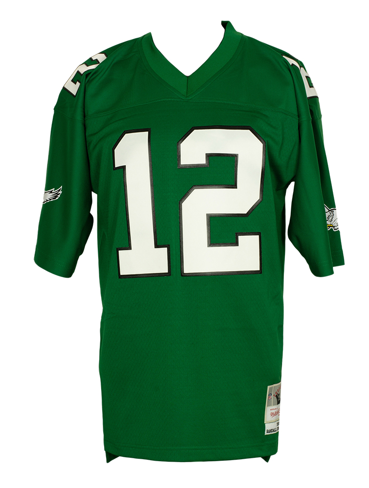 Mitchell & Ness throwback on-field style jersey. Everything is sewn on, size XL. Hand-signed in black felt-tip pen by Randall Cunningham (Philadelphia Eagles).