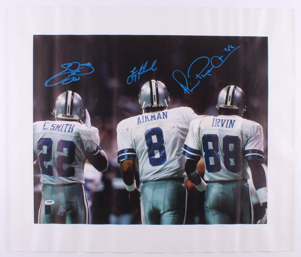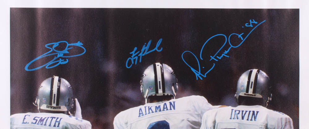 Dallas Cowboys print measures approximately 25.75" x 30.5" in size and has been hand signed in blue paint pen by Emmitt Smith (HOF), Troy Aikman (HOF) and Michael Irvin (HOF).