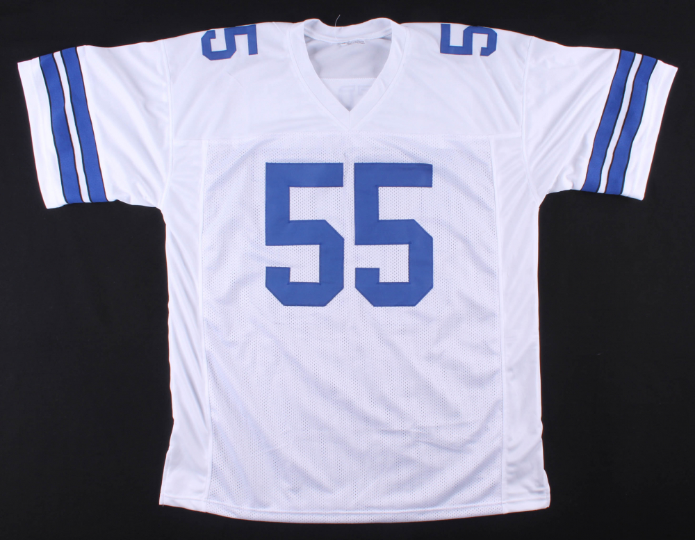 Custom on-field style jersey. Everything is sewn on, size XL. Has been hand-signed in silver paint pen by Leighton Vander Esch.