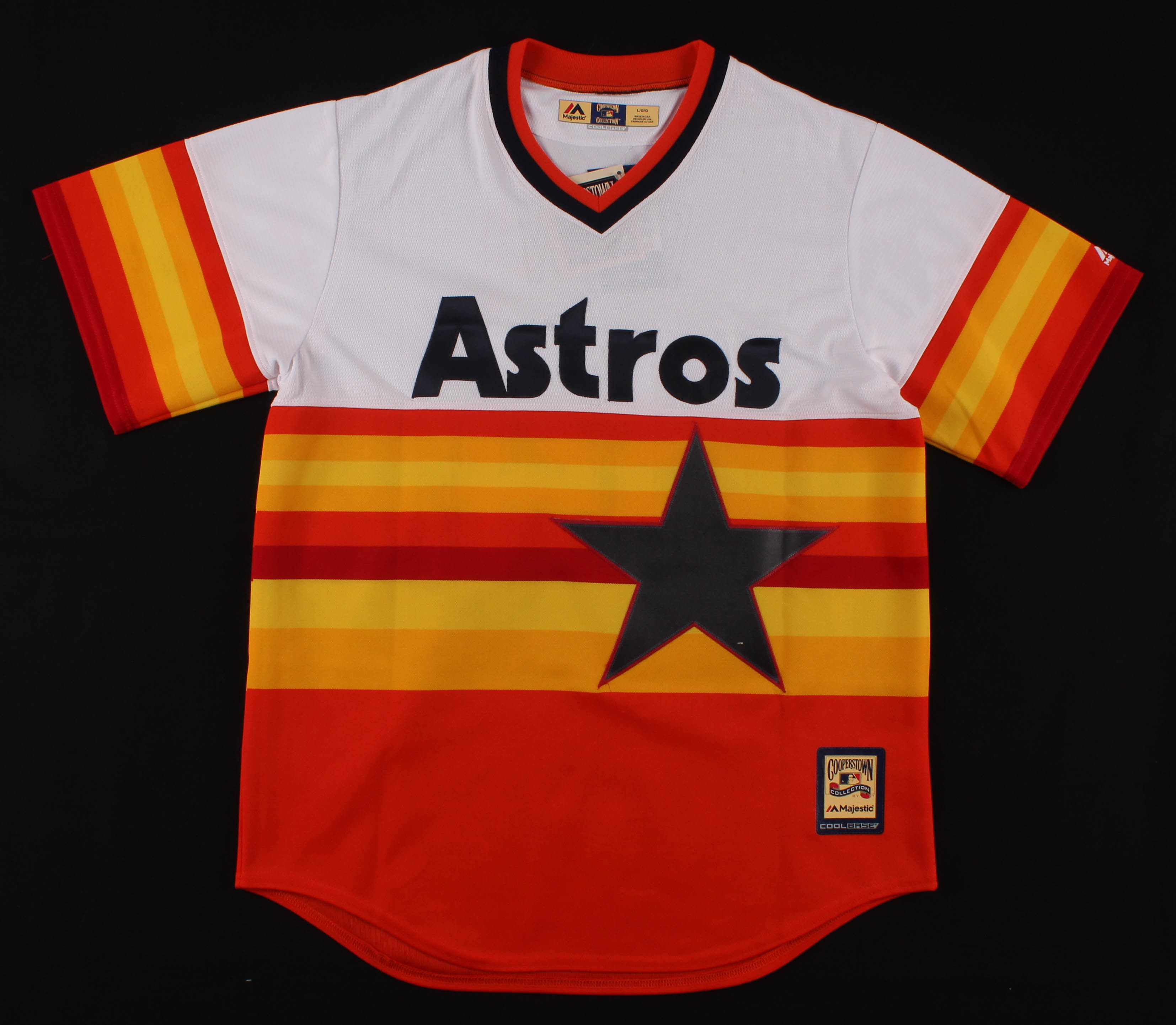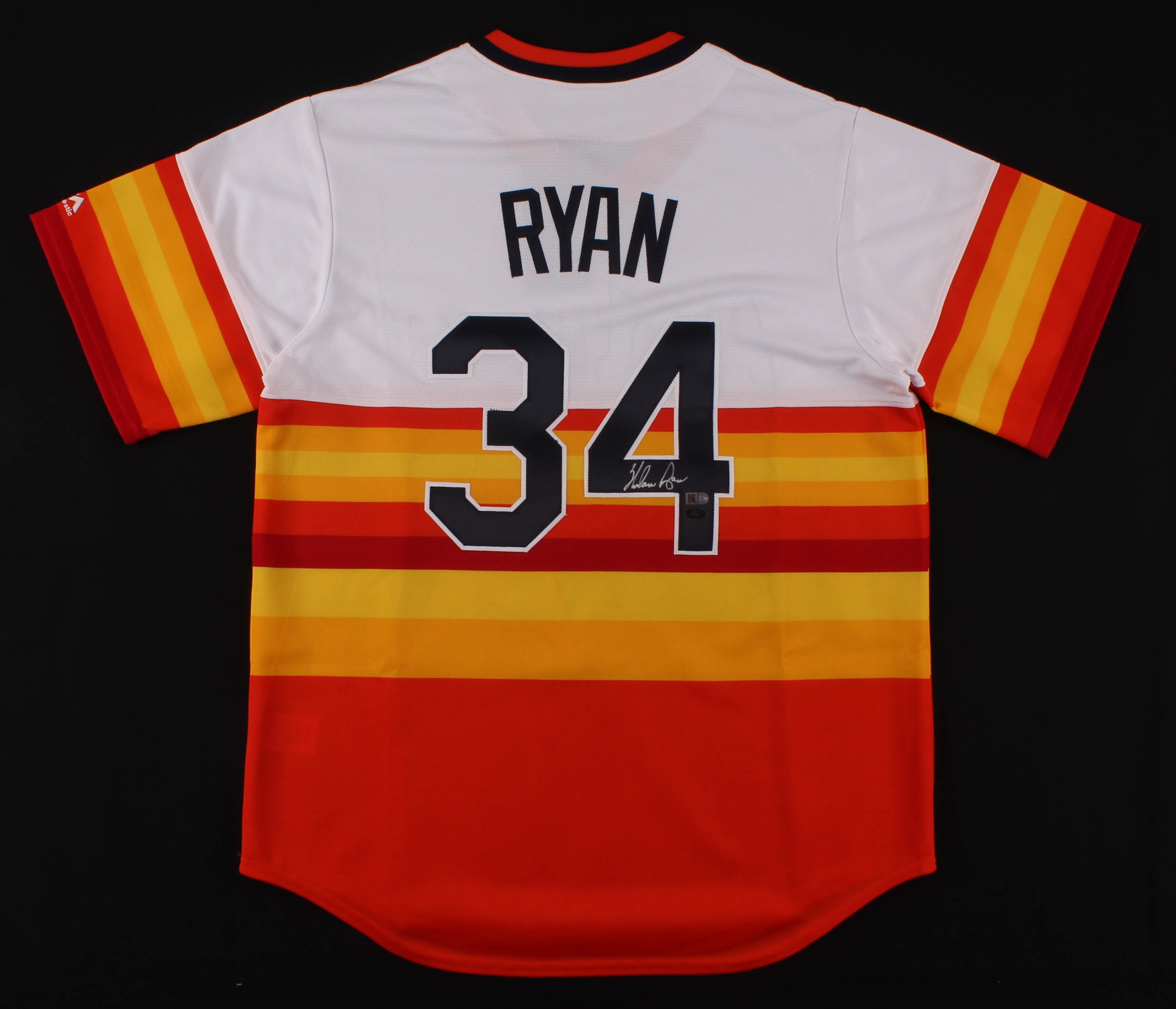 Majestic on-field style jersey. Everything sewn on, size XL. Hand-signed in silver paint pen by Nolan Ryan (Houston Astros, HOF).