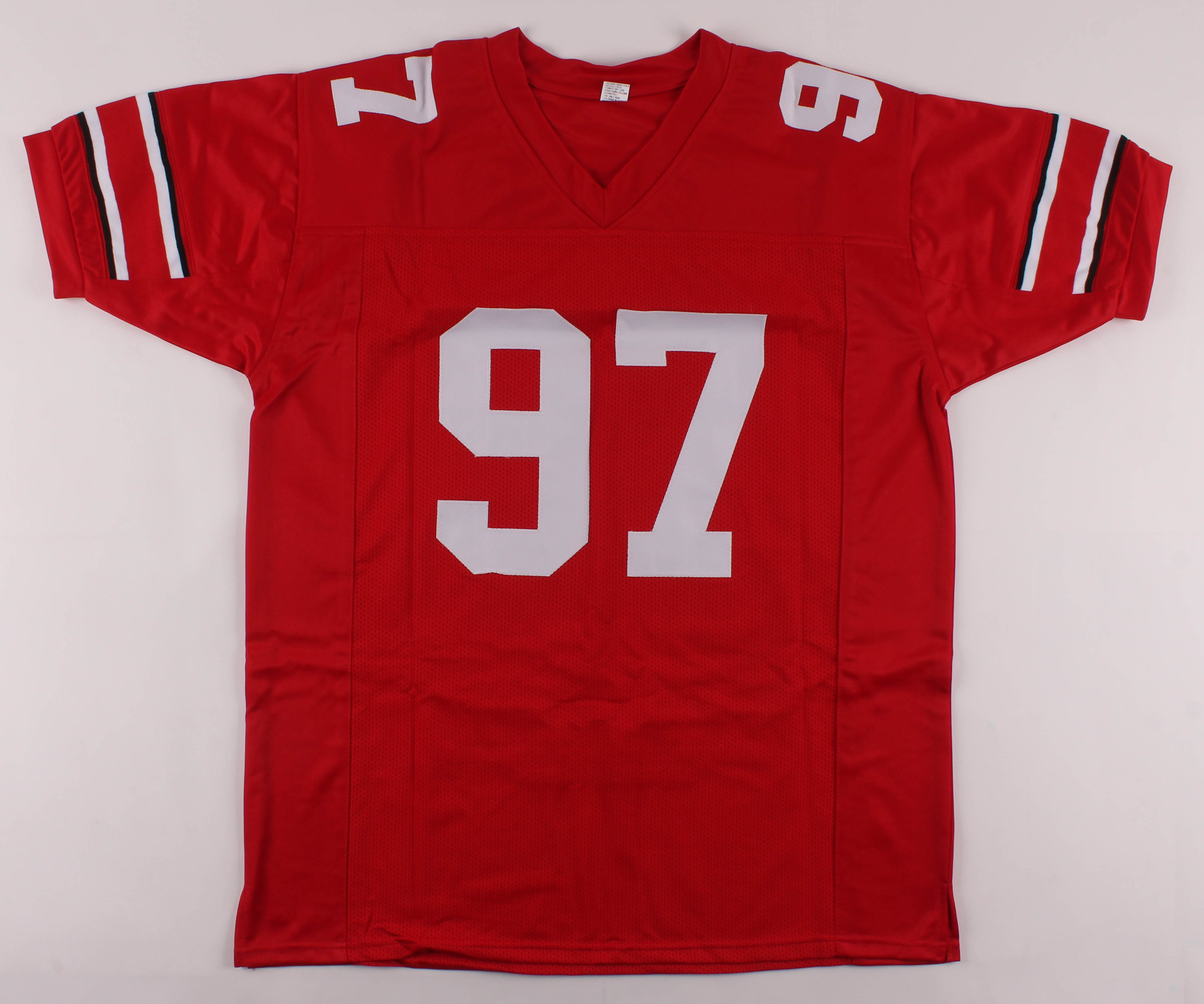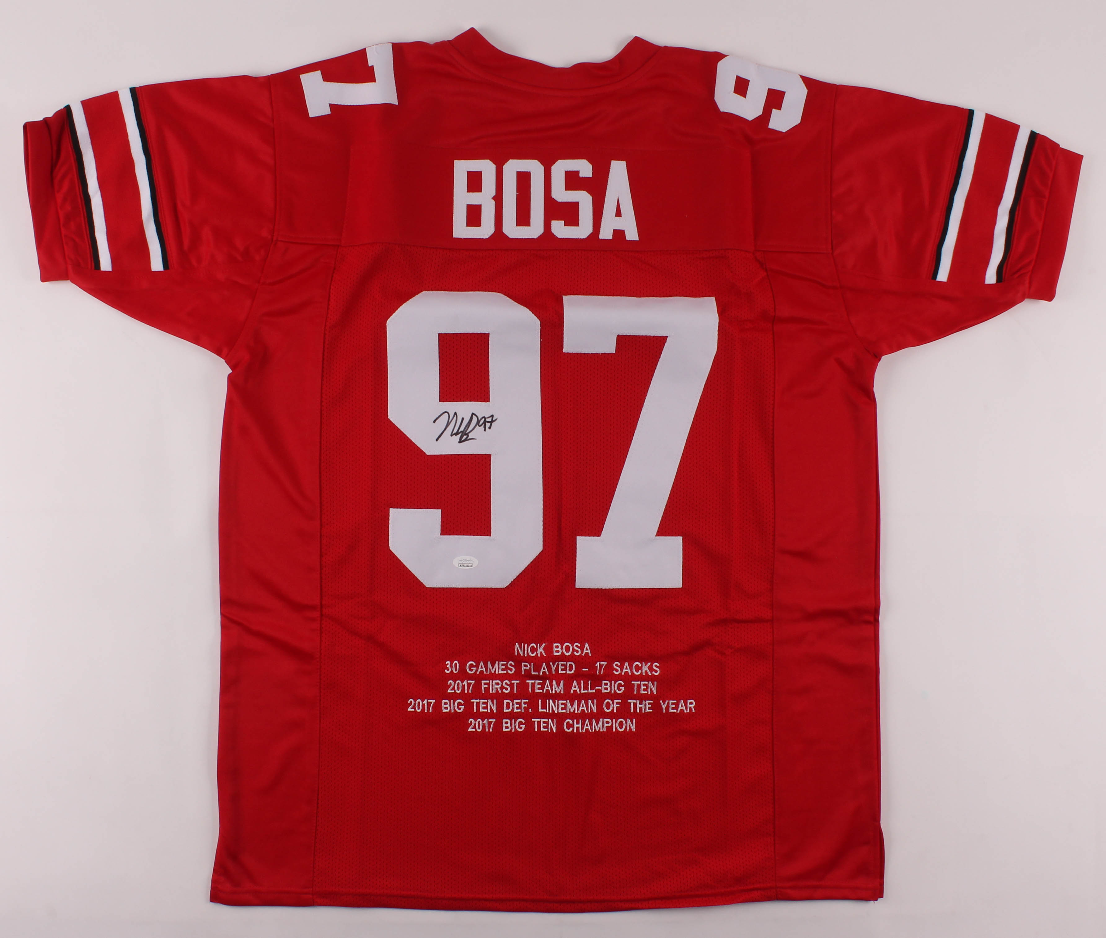 Custom on-field style jersey. Everything sewn on, size XL. Hand-signed in black felt-tip pen by Joey Bosa. Bosa's college career highlights have been custom stitched onto the back of the jersey below the reverse numbers.