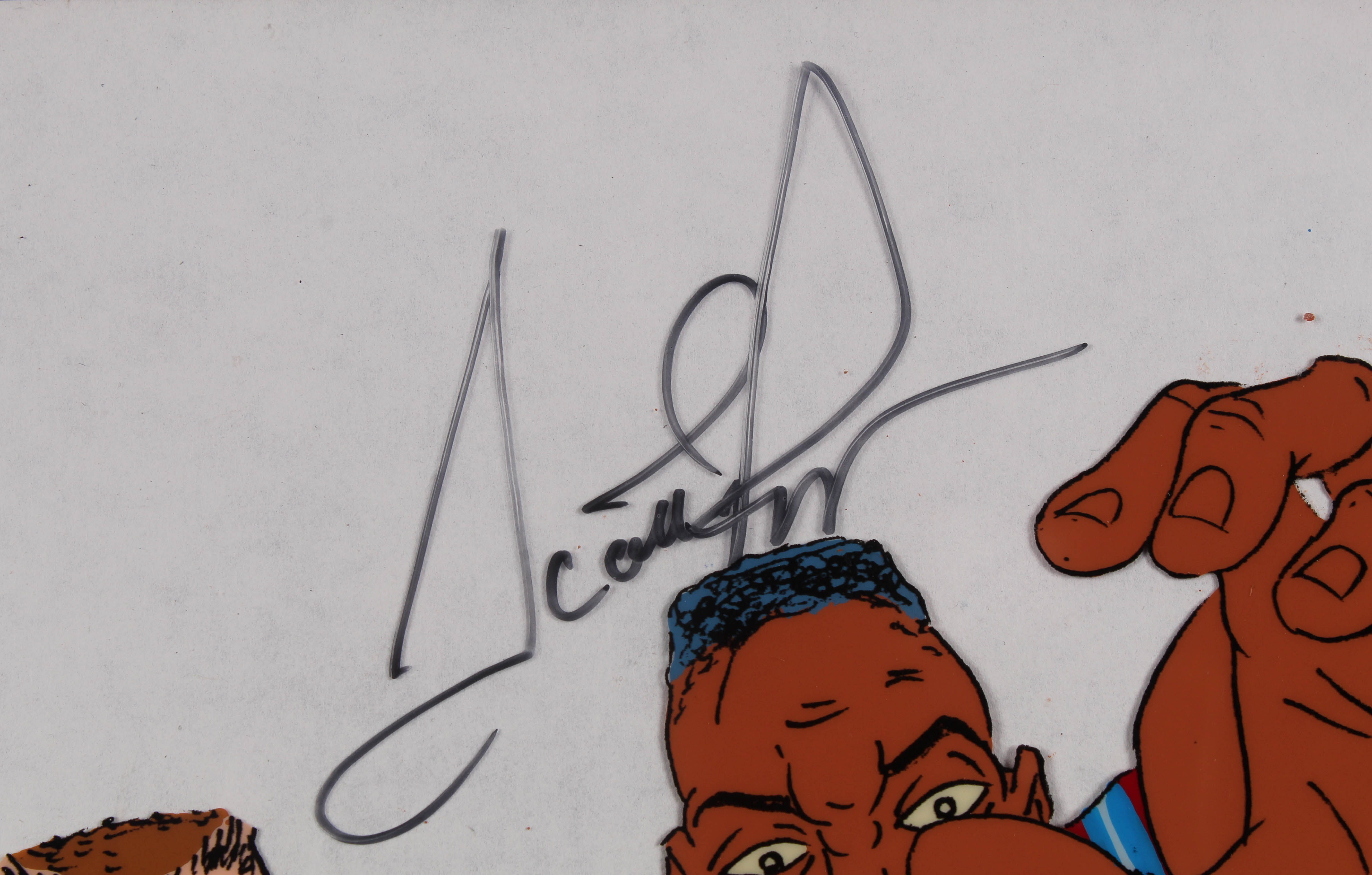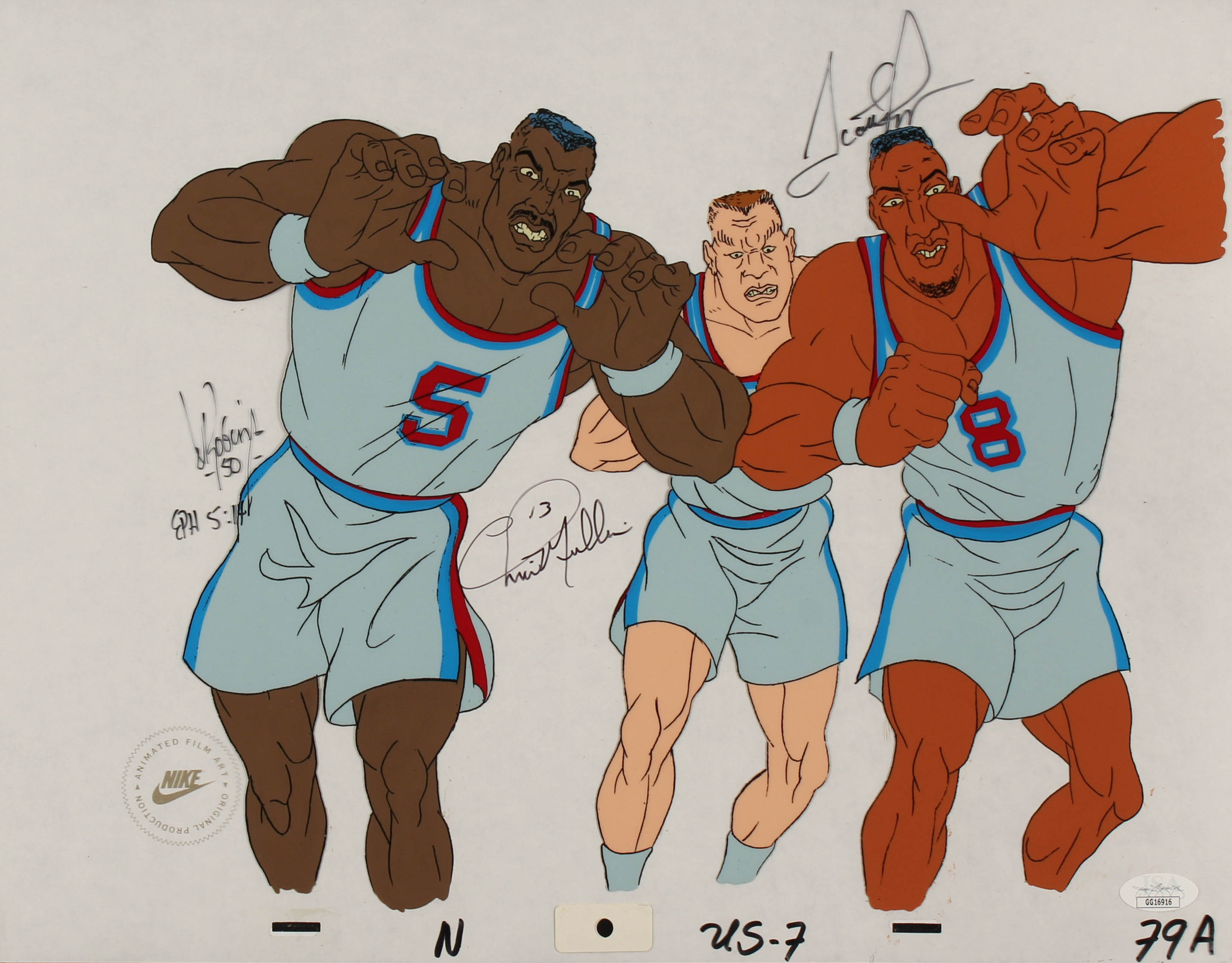 Original animation production cel measures 13" x 17" in size and has been hand-signed in black felt-tip pen by Scottie Pippen (HOF), Chris Mullins (HOF) and David Robinson (HOF). The cel was used in the production of the 1992 Nike Dream Team Commercial.