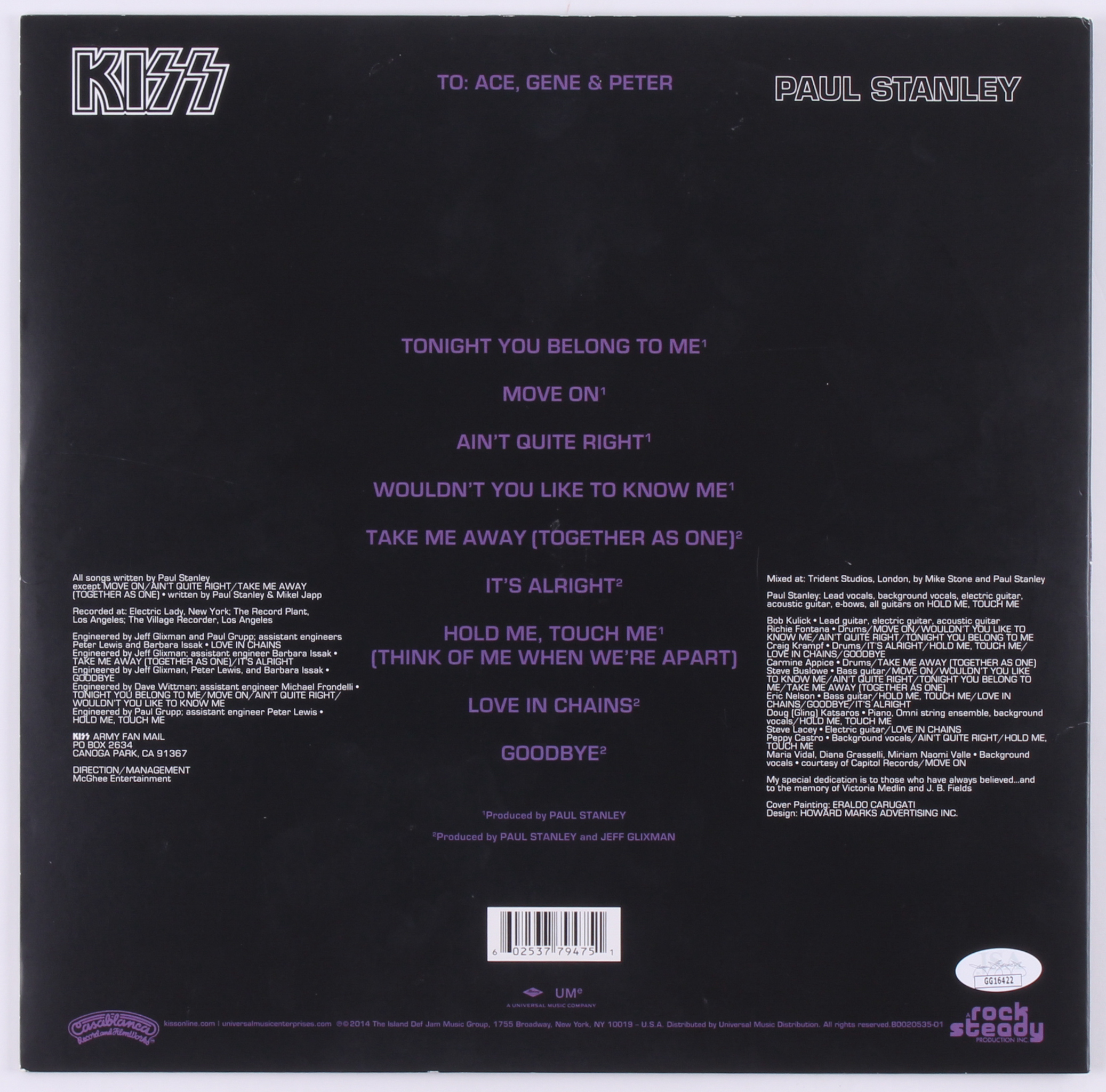 Paul Stanley Signed "Kiss" Vinyl Record Album Cover (JSA COA)