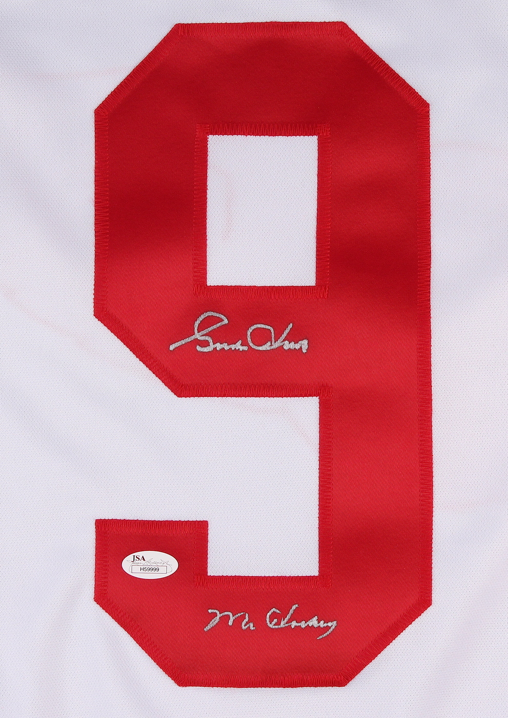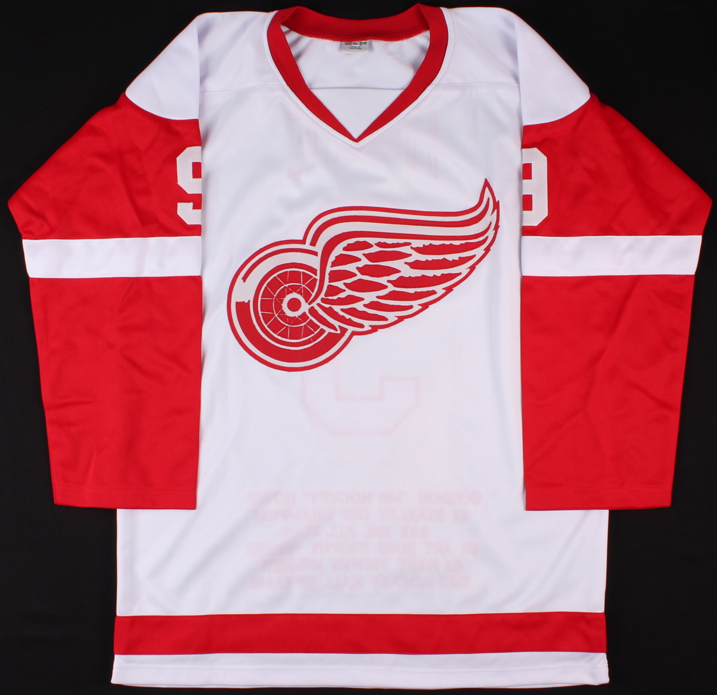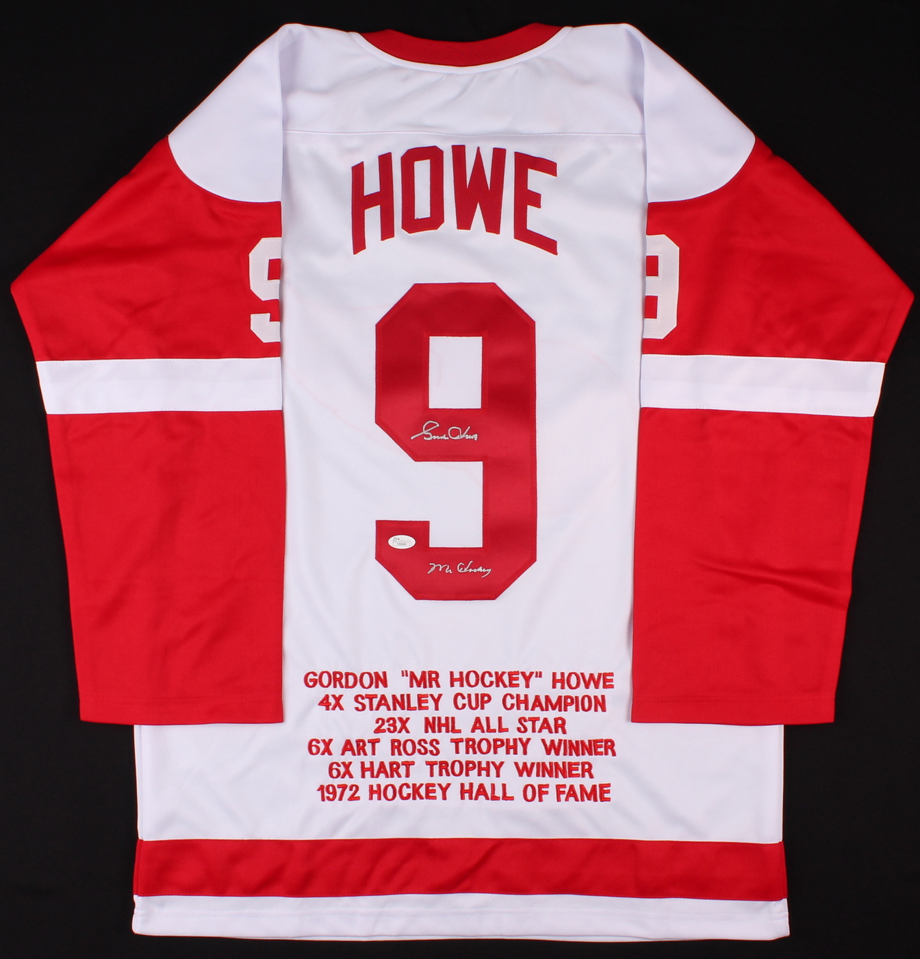 Custom on-ice style jersey. Everything sewn on, size XL. Hand-signed and inscribed in silver paint pen by Gordie Howe. Howe's career stats are custom stitched below the reverse number. The autograph includes an official James Spence Authentication (JSA) hologram and matching COA for authenticity purposes.