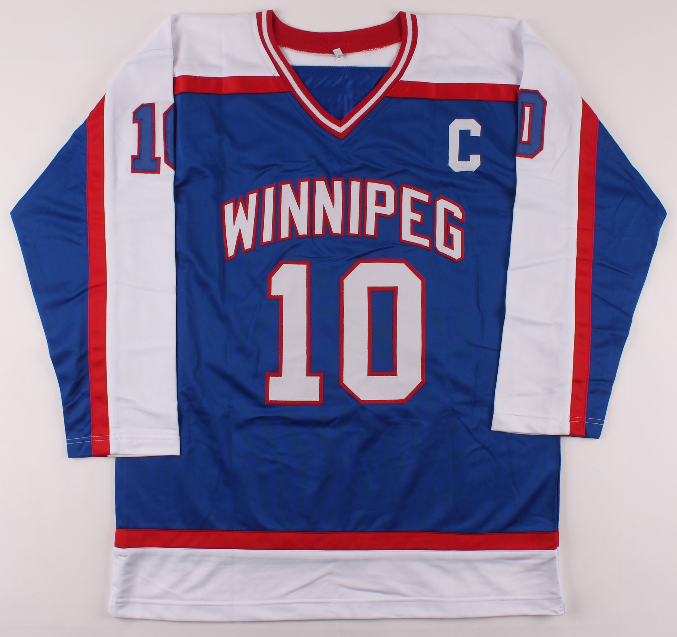 Custom on-ice style jersey. Everything is sewn on, size XL. Has been hand-signed and inscribed in blue felt-tip pen by Dale Hawerchuk (HOF).