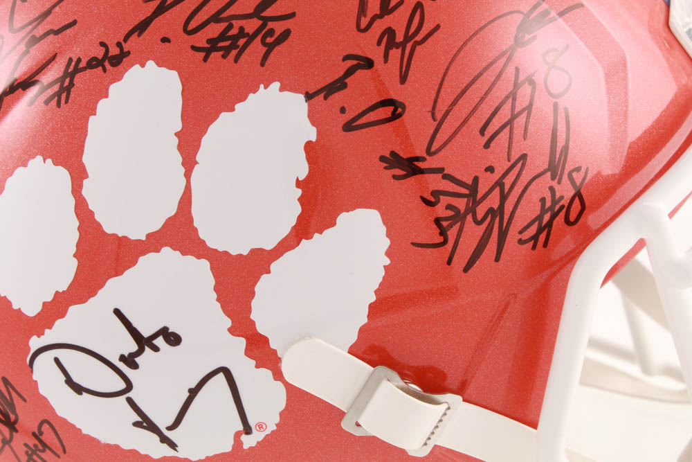 2019 Clemson Tigers Full-Size Speed replica helmet has been hand-signed in black felt-tip pen by (38) including Dabo Swinney (HC), Justyn Ross, Amari Rodgers, Travis Etienne, Ruke Orhorhoro, Diondre Oerton, Xavier Kelly, Jaelyn Lay, Justin Foster, Nyles Pinckney, James Skalski, Regan Upshaw, Luke Price, Andrew Booth Jr, Chase Brice, Steven Sawicki, Frank Ladson Jr. A.J. Terrell, Justin Mascoll, Chez Mellusi, Chad Smith, Tyler Brown, Tayquon Johnson, and (13) others.