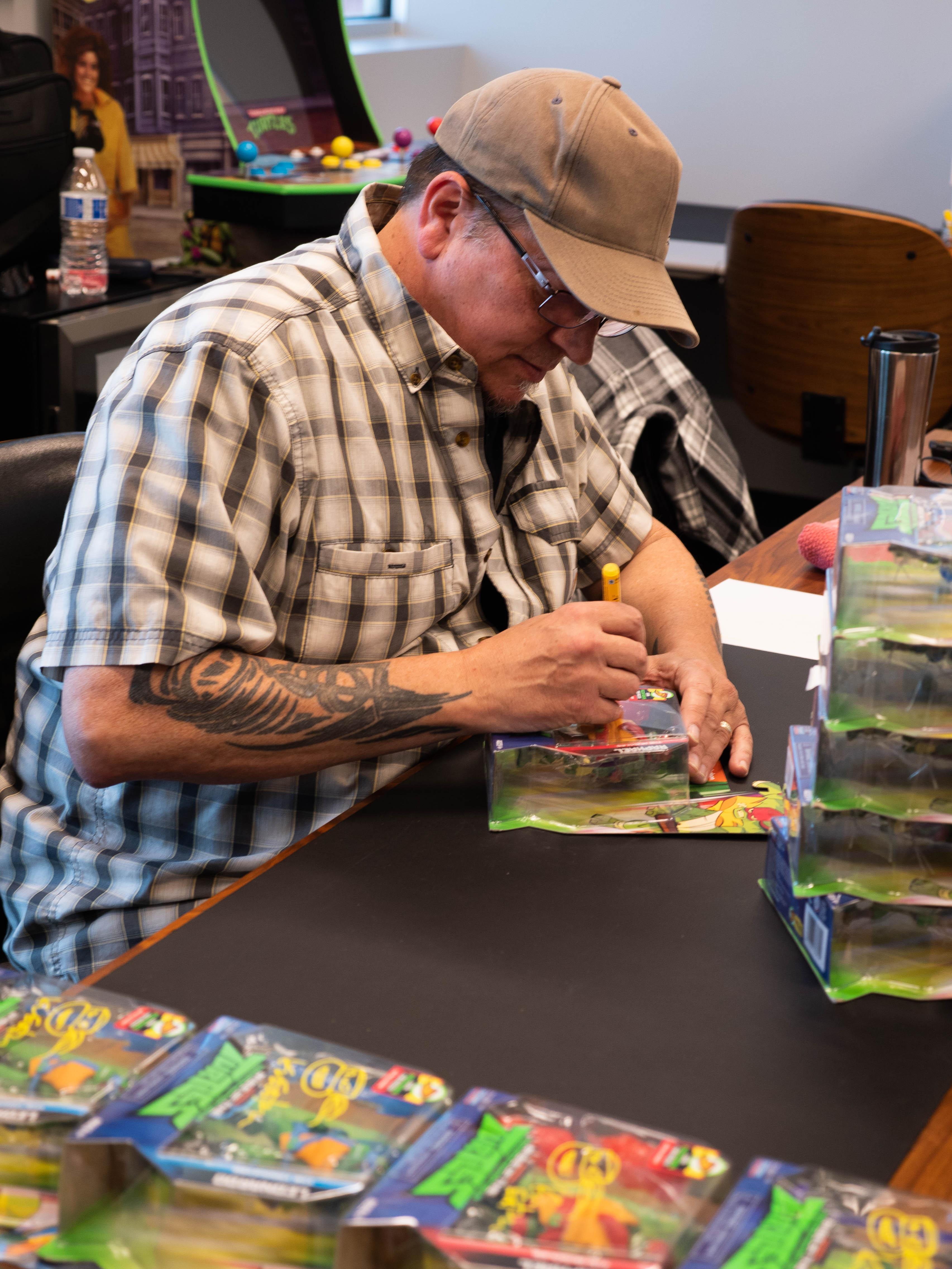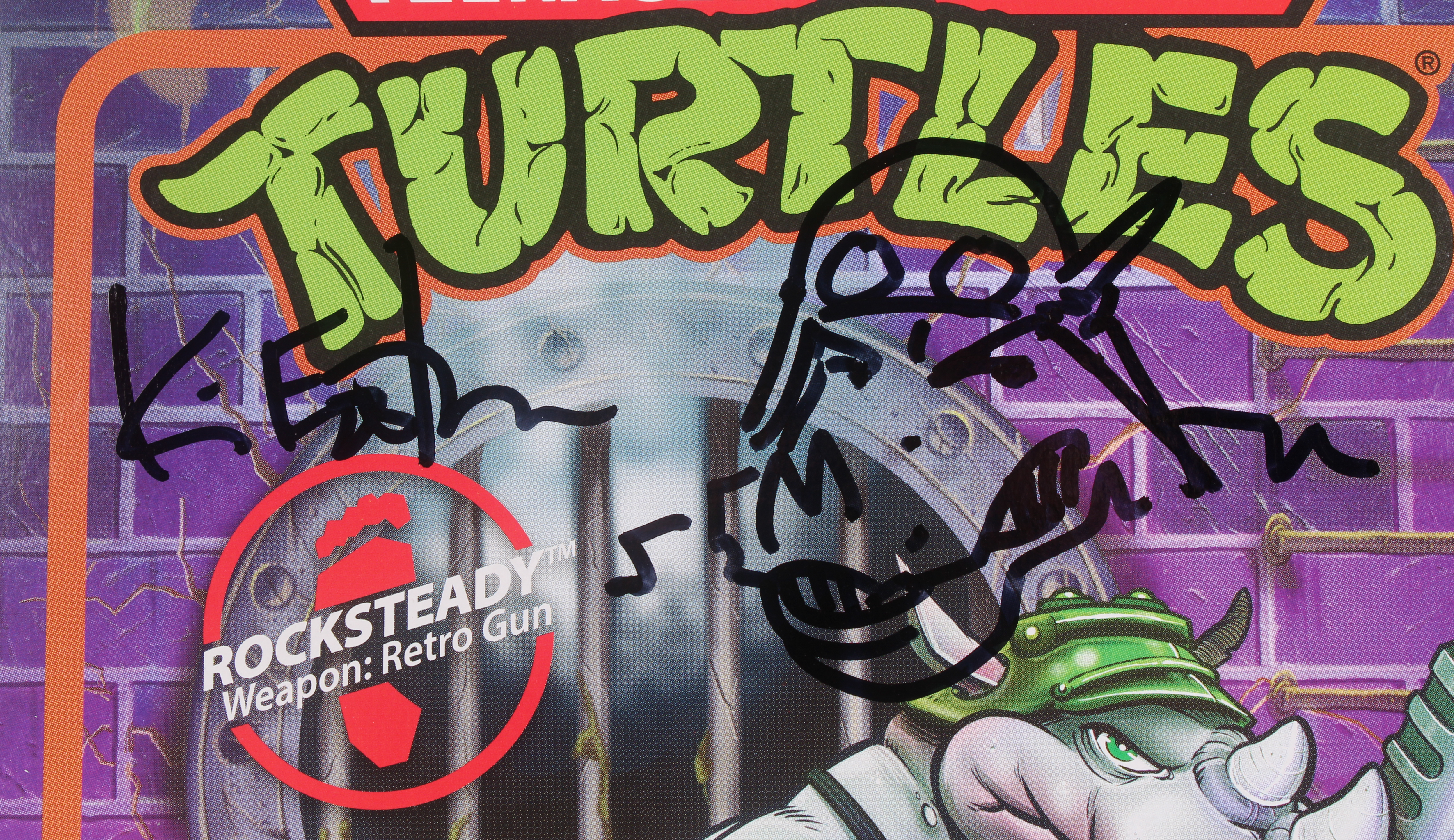 This officially licensed Teenage Mutant Ninja Turtles Rocksteady ReAction action figure measures approximately 4" in height. The packaging is hand-signed in black felt-tip pen, along with an original hand-drawn Rocksteady sketch, by the co-creator of the Teenage Mutant Ninja Turtles (TMNT), Kevin Eastman.