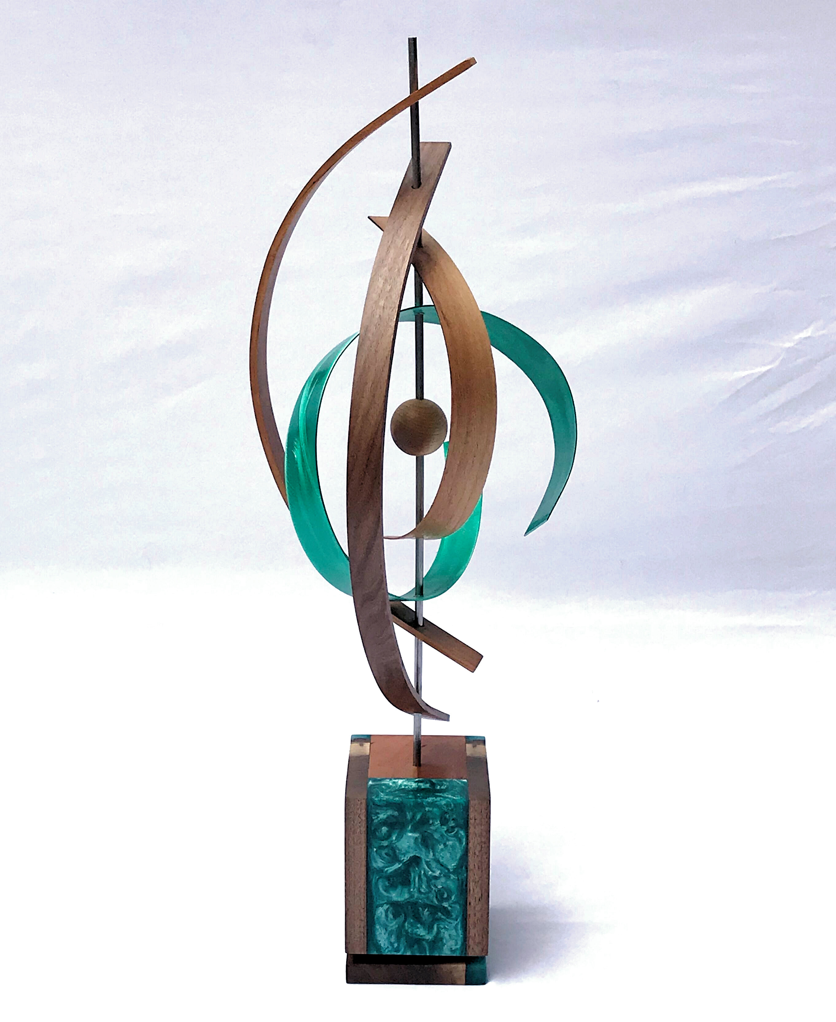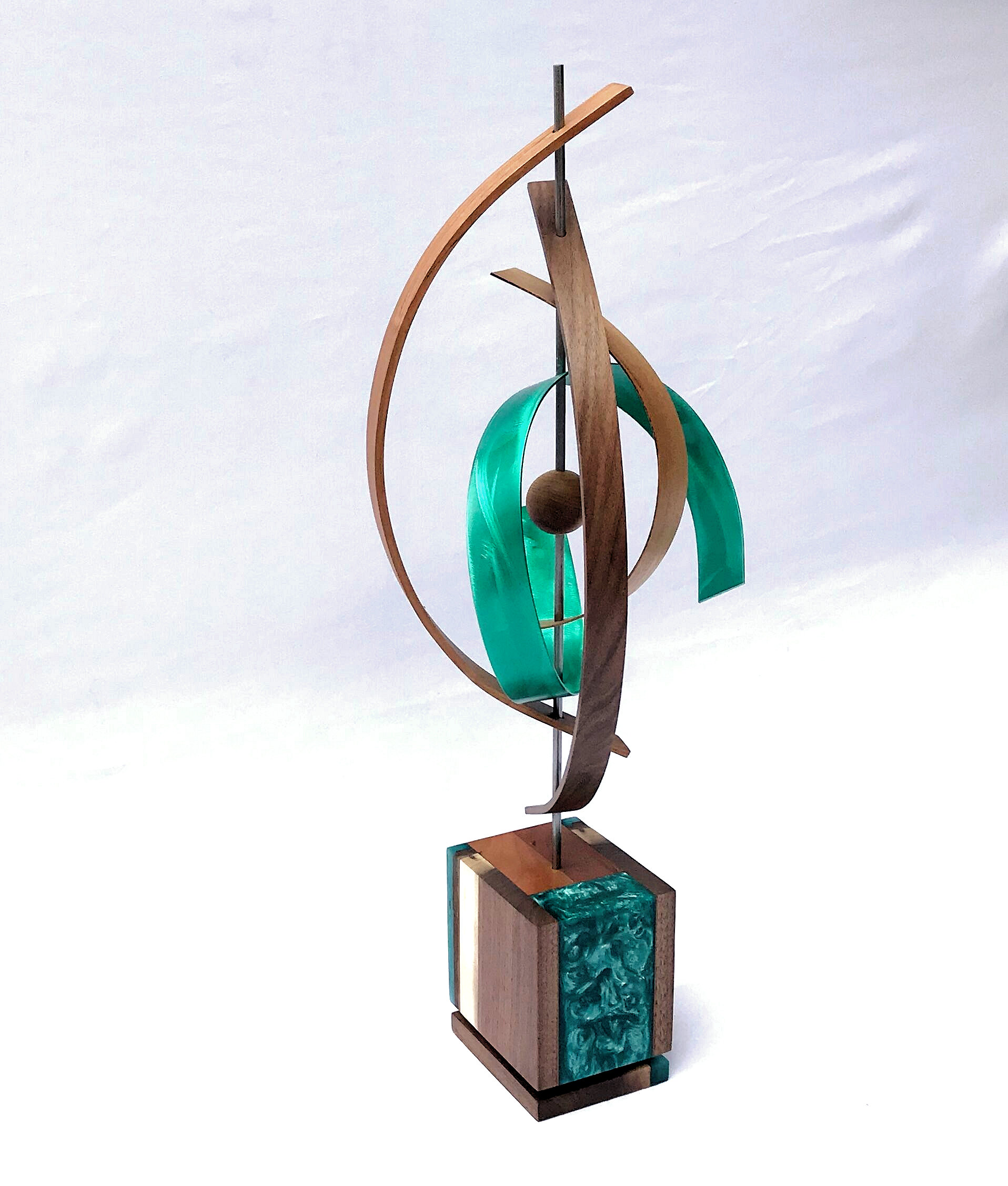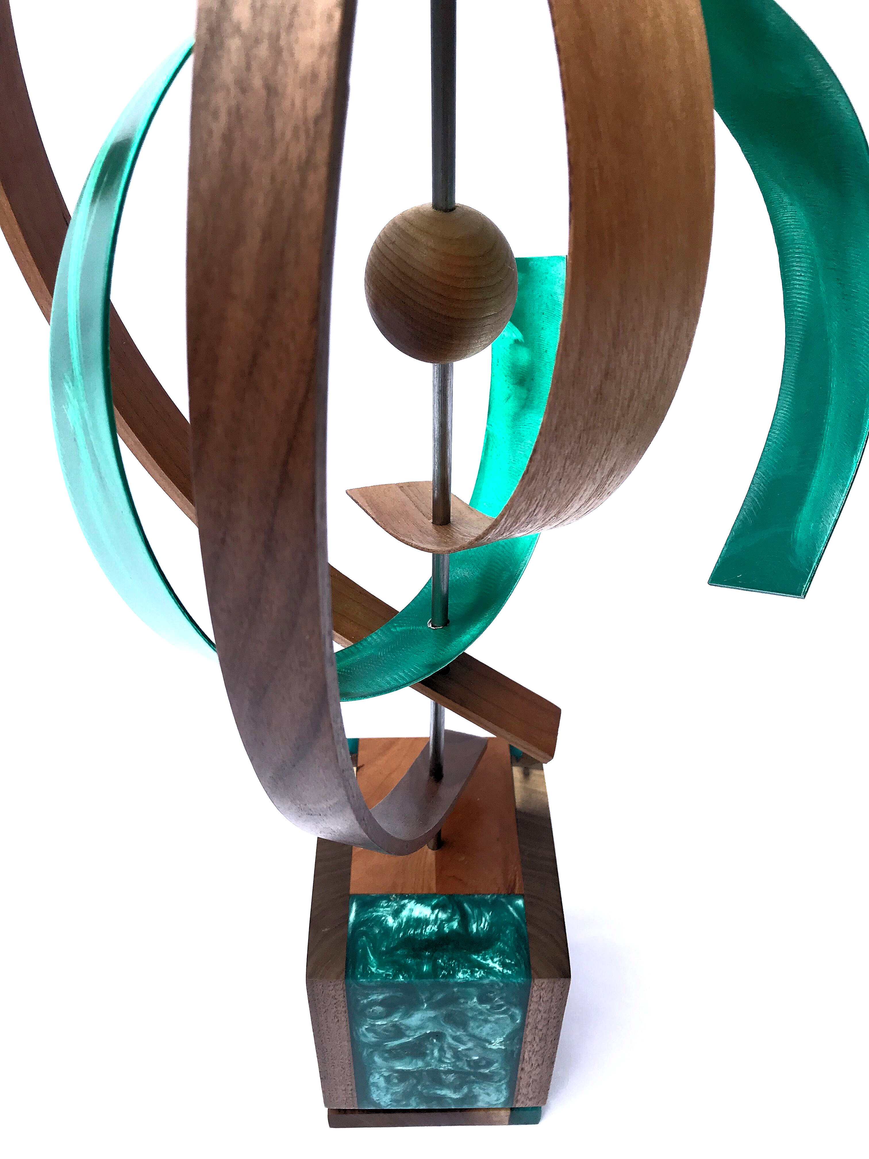 Formed black walnut and cherry slats twisting with blue/green aluminum slat while suspending a wooden sphere. The complementary base has a semi-gloss finish and features blue/green epoxy inlay with personalized turntable for 360 degree rotation.