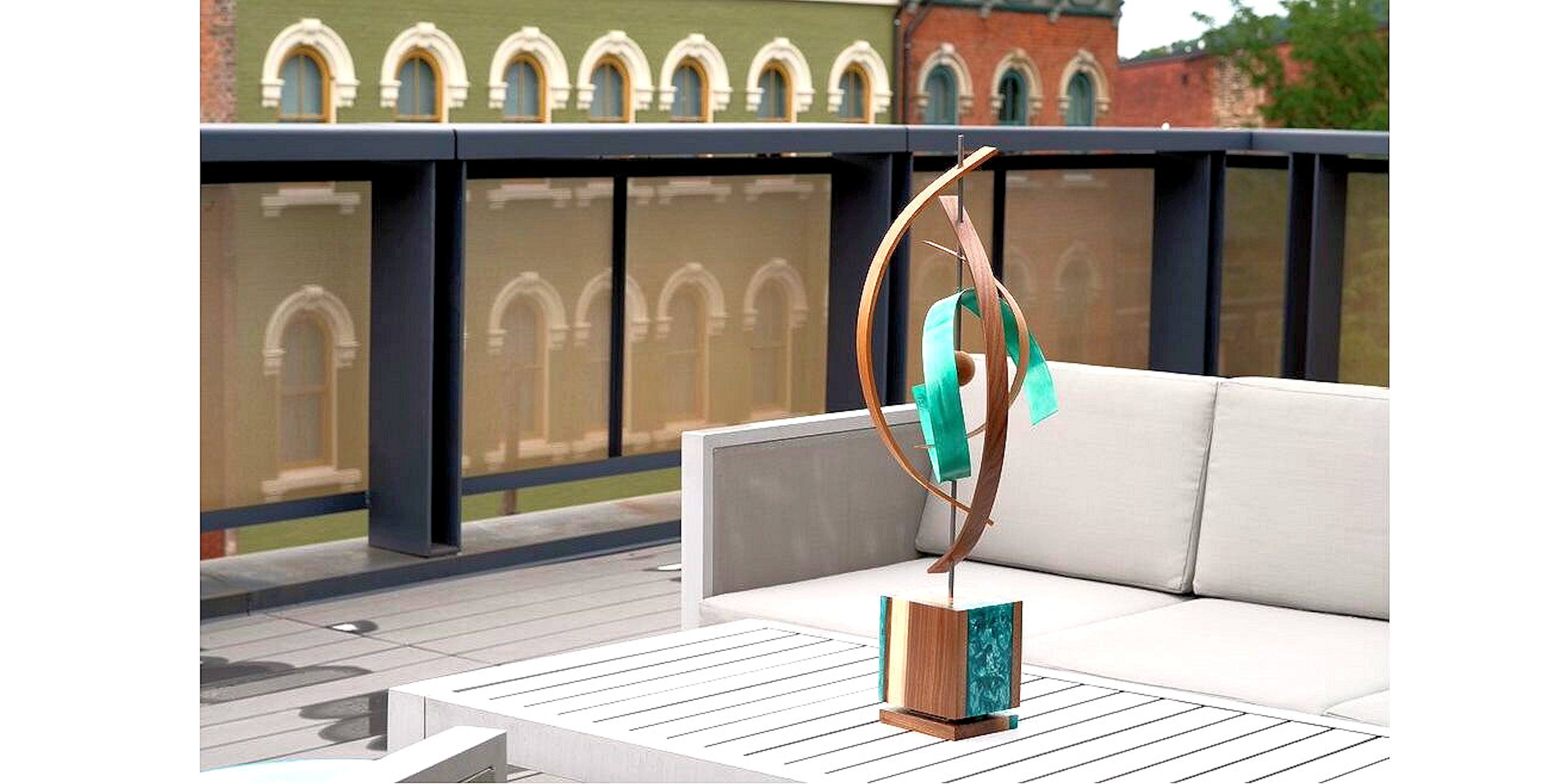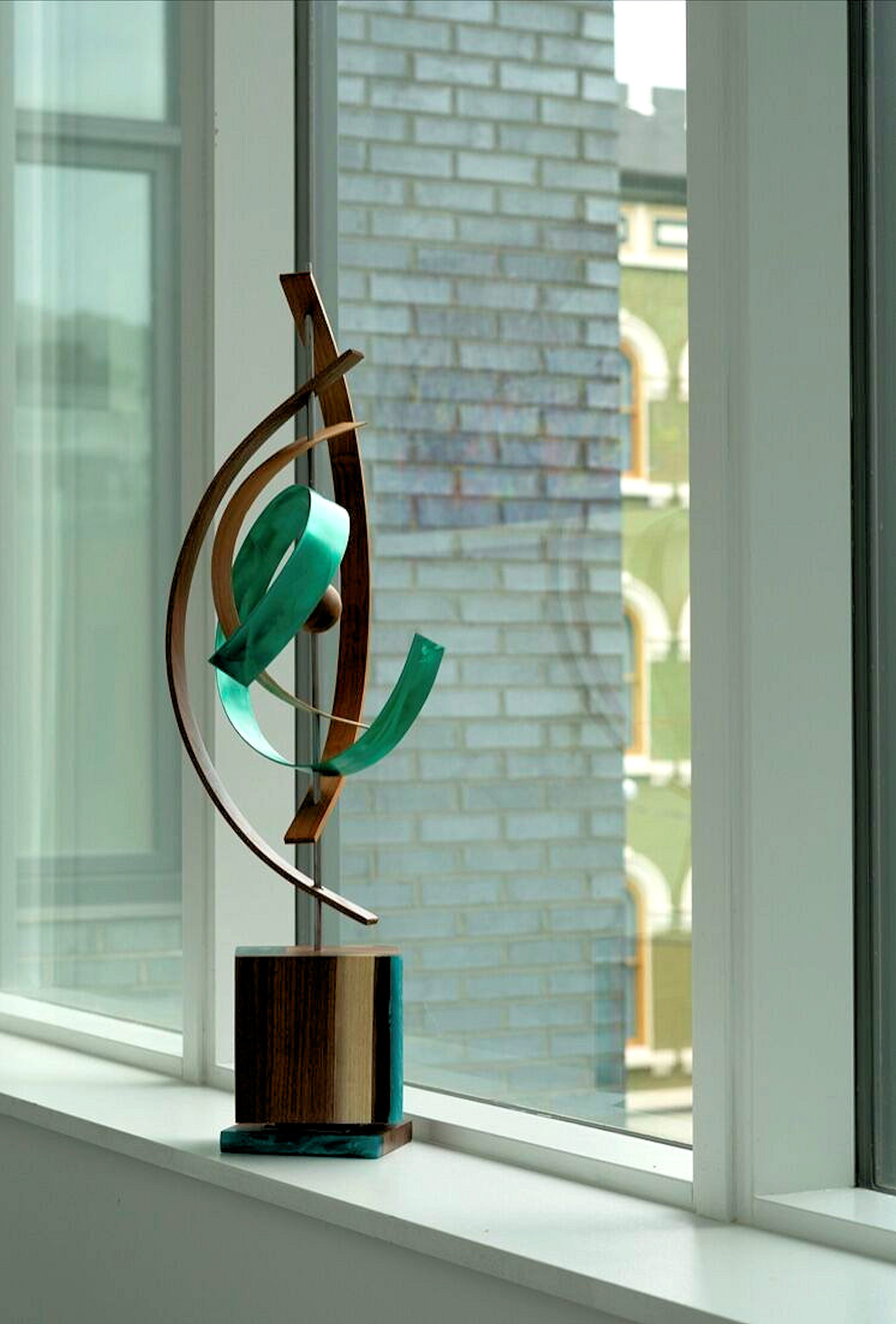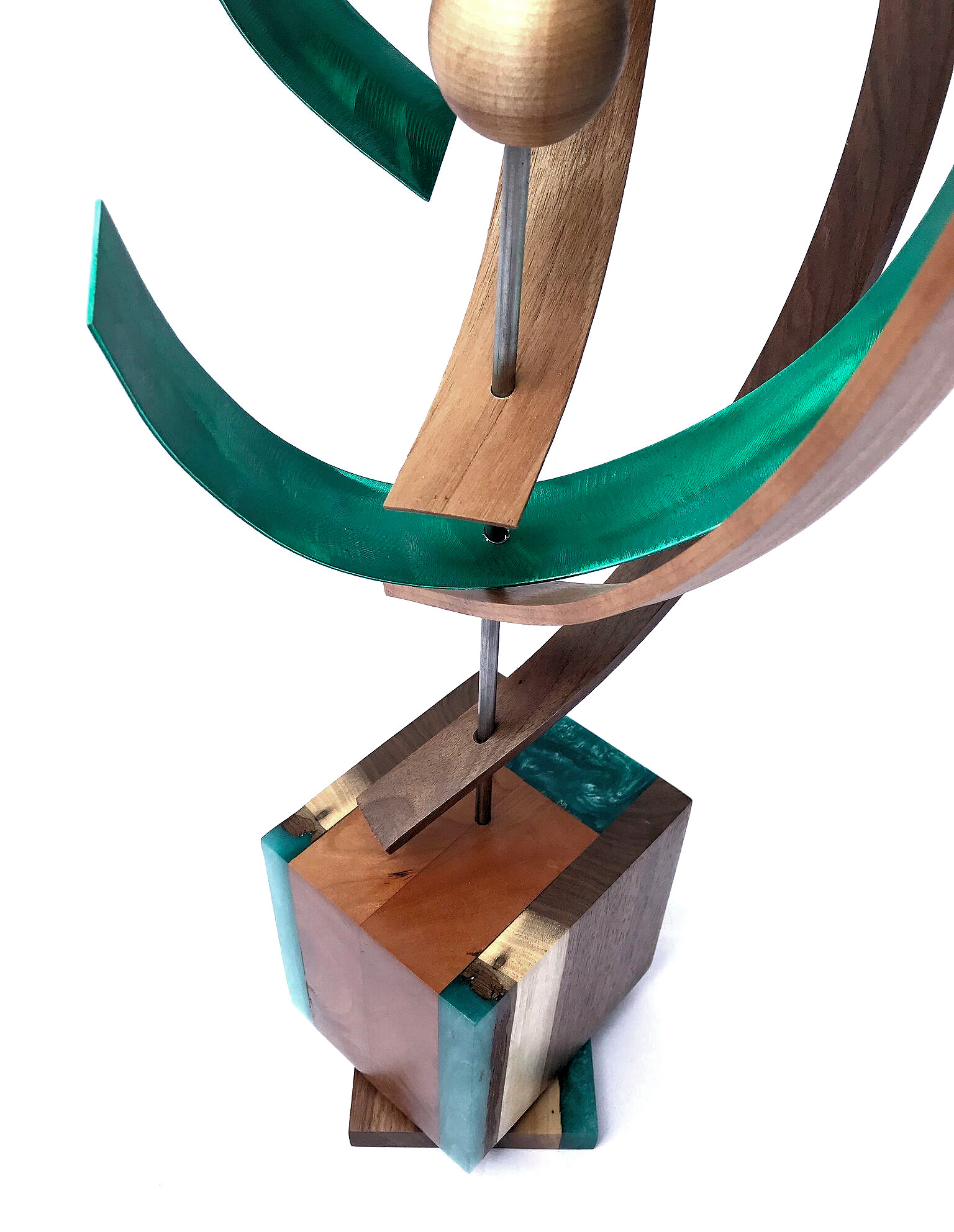 Formed black walnut and cherry slats twisting with blue/green aluminum slat while suspending a wooden sphere. The complementary base has a semi-gloss finish and features blue/green epoxy inlay with personalized turntable for 360 degree rotation.