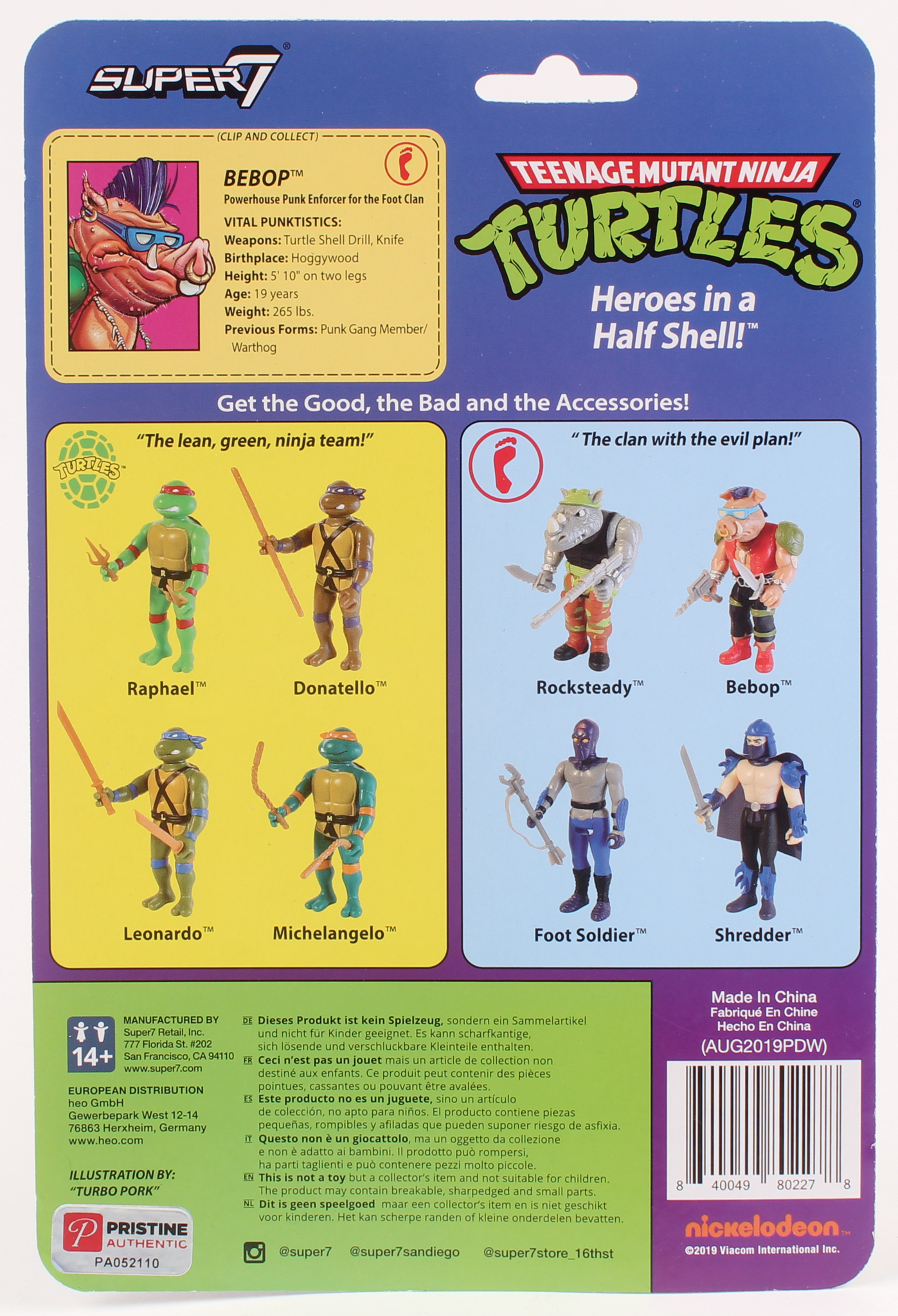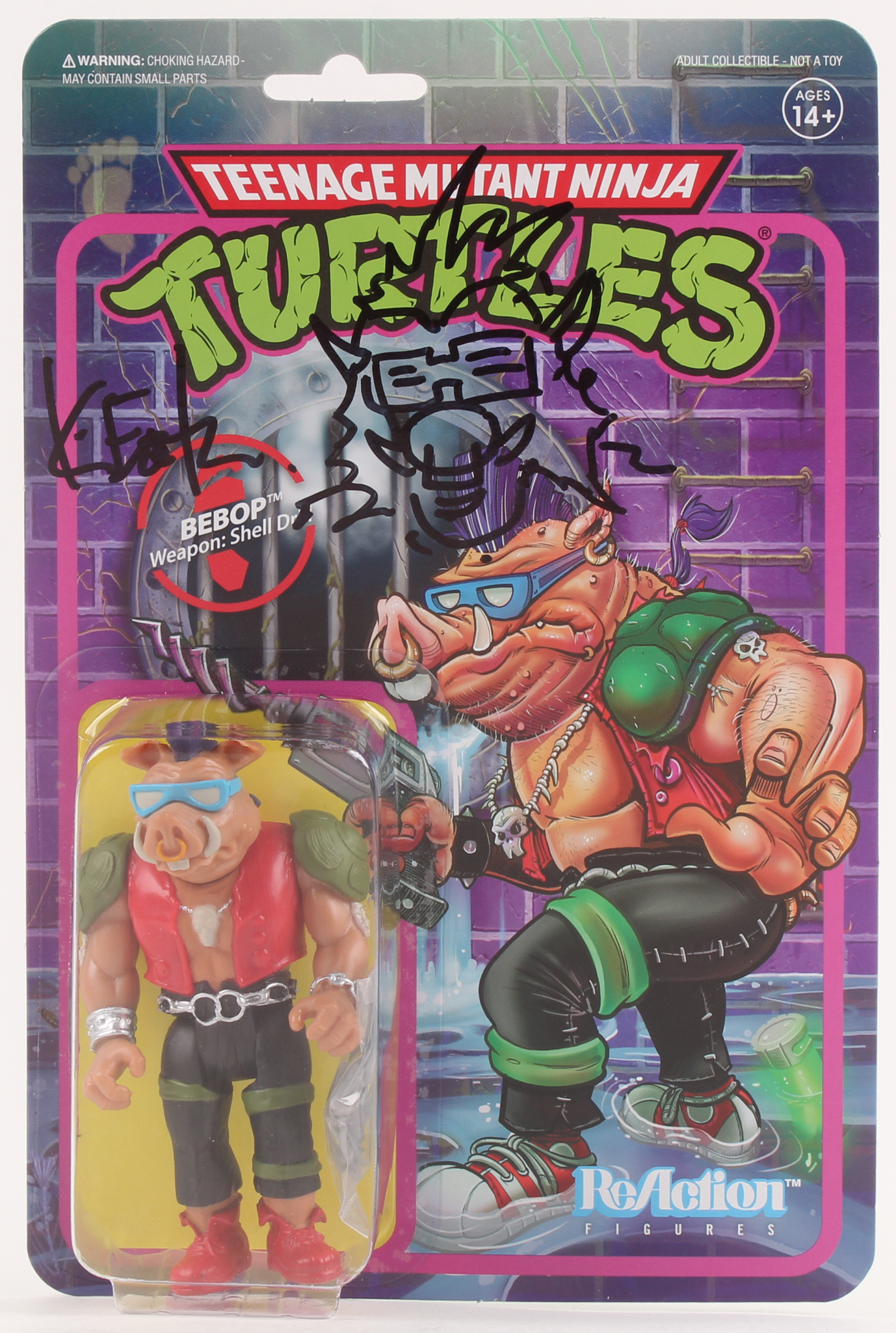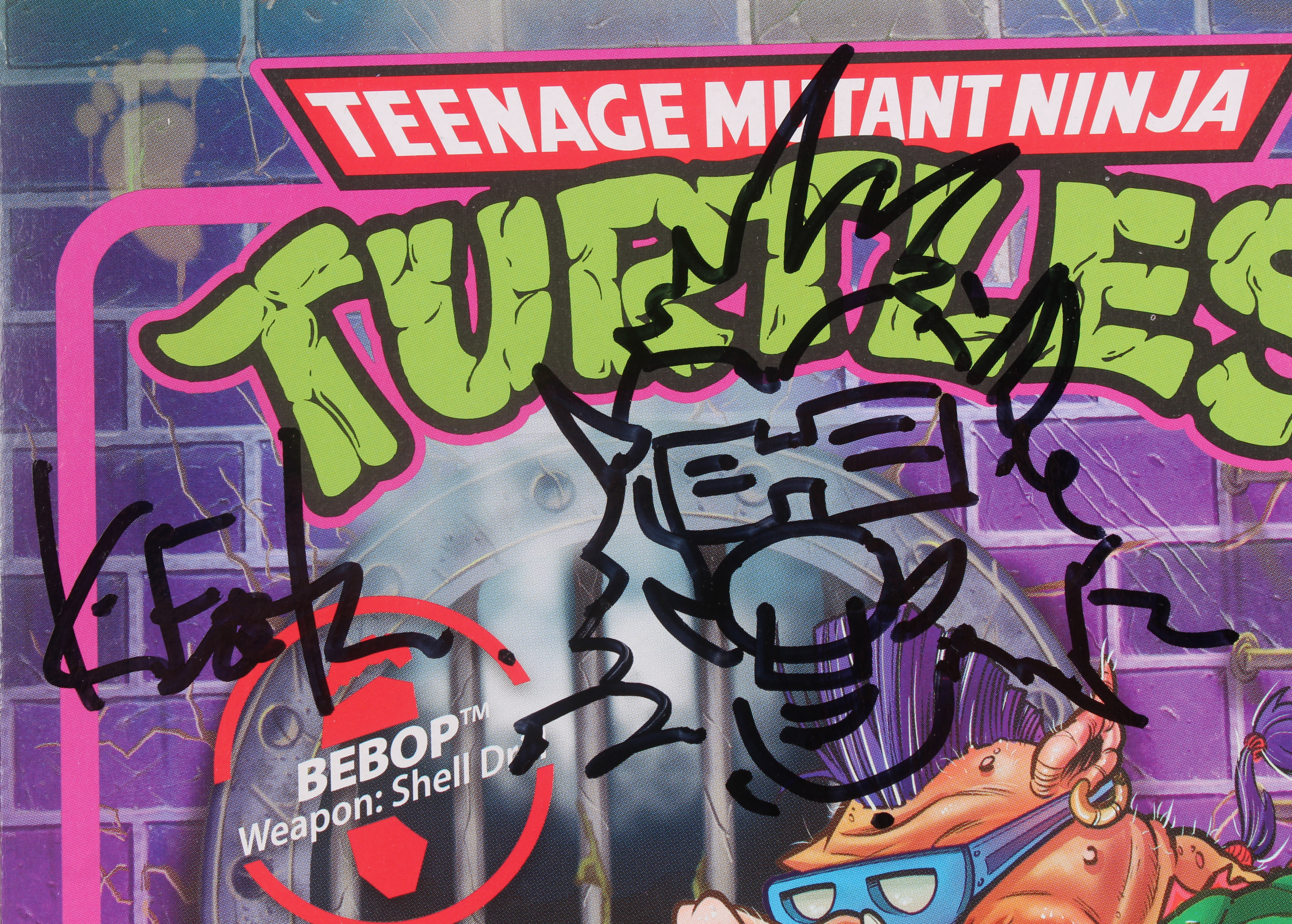 This officially licensed Teenage Mutant Ninja Turtles Bebop ReAction action figure measures approximately 4" in height. The packaging is hand-signed in black felt-tip pen, along with an original hand-drawn Bebop sketch, by the co-creator of the Teenage Mutant Ninja Turtles (TMNT), Kevin Eastman.