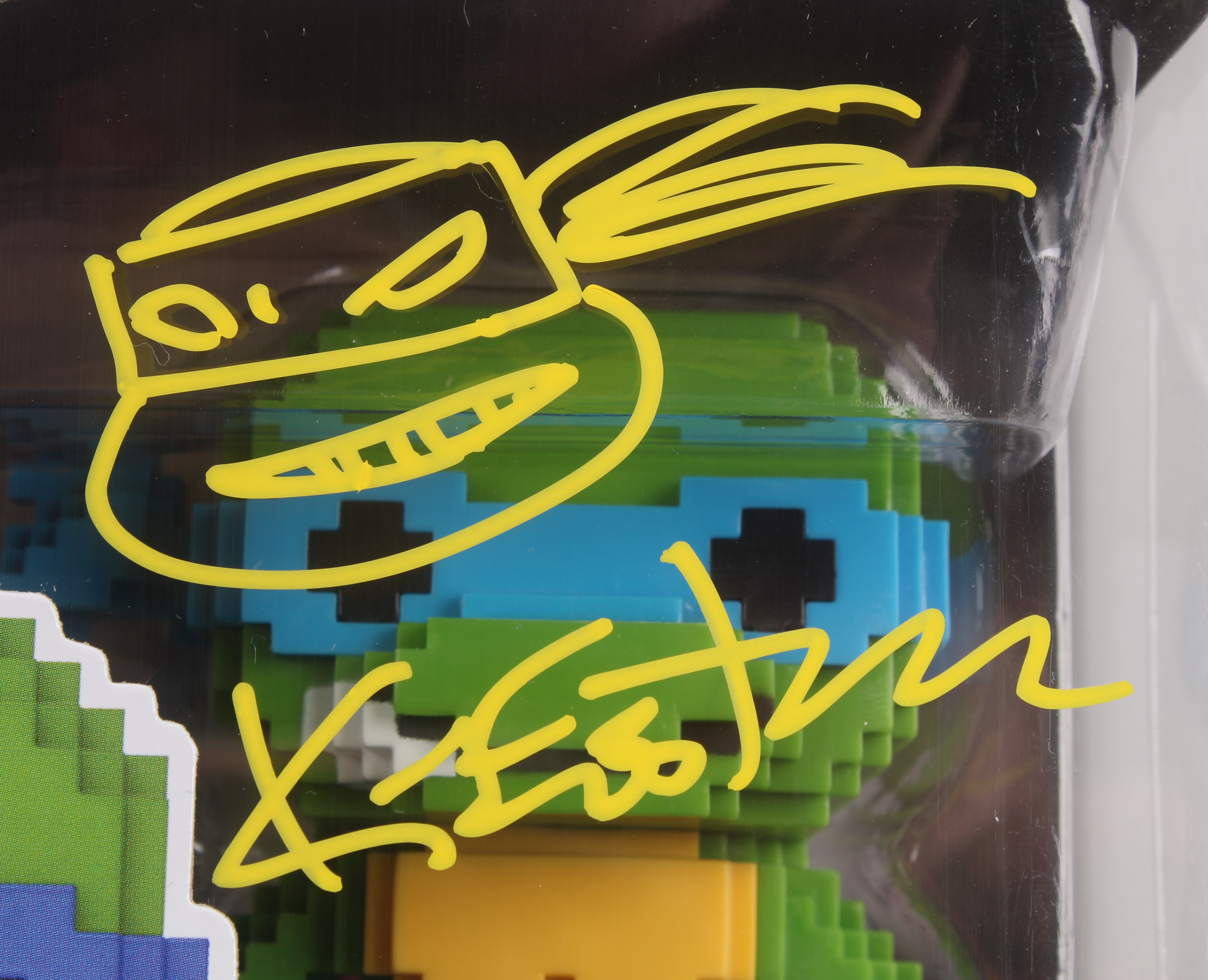 Figure measures approximately 4" tall and comes in the original box. Hand-signed in yellow paint pen, along with an original hand-drawn Turtles sketch, by the co-creator of the Teenage Mutant Ninja Turtles (TMNT), Kevin Eastman.