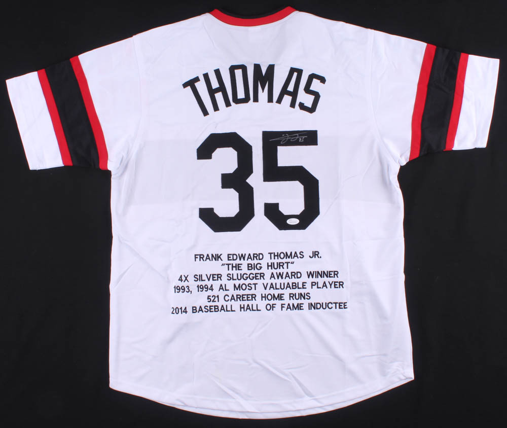 Custom on-field style jersey. Everything is sewn on, size XL. Has been hand-signed in silver paint pen by Frank Thomas (HOF). Thomas' career highlights have been custom stitched onto the back of the jersey below the reverse numbers.
