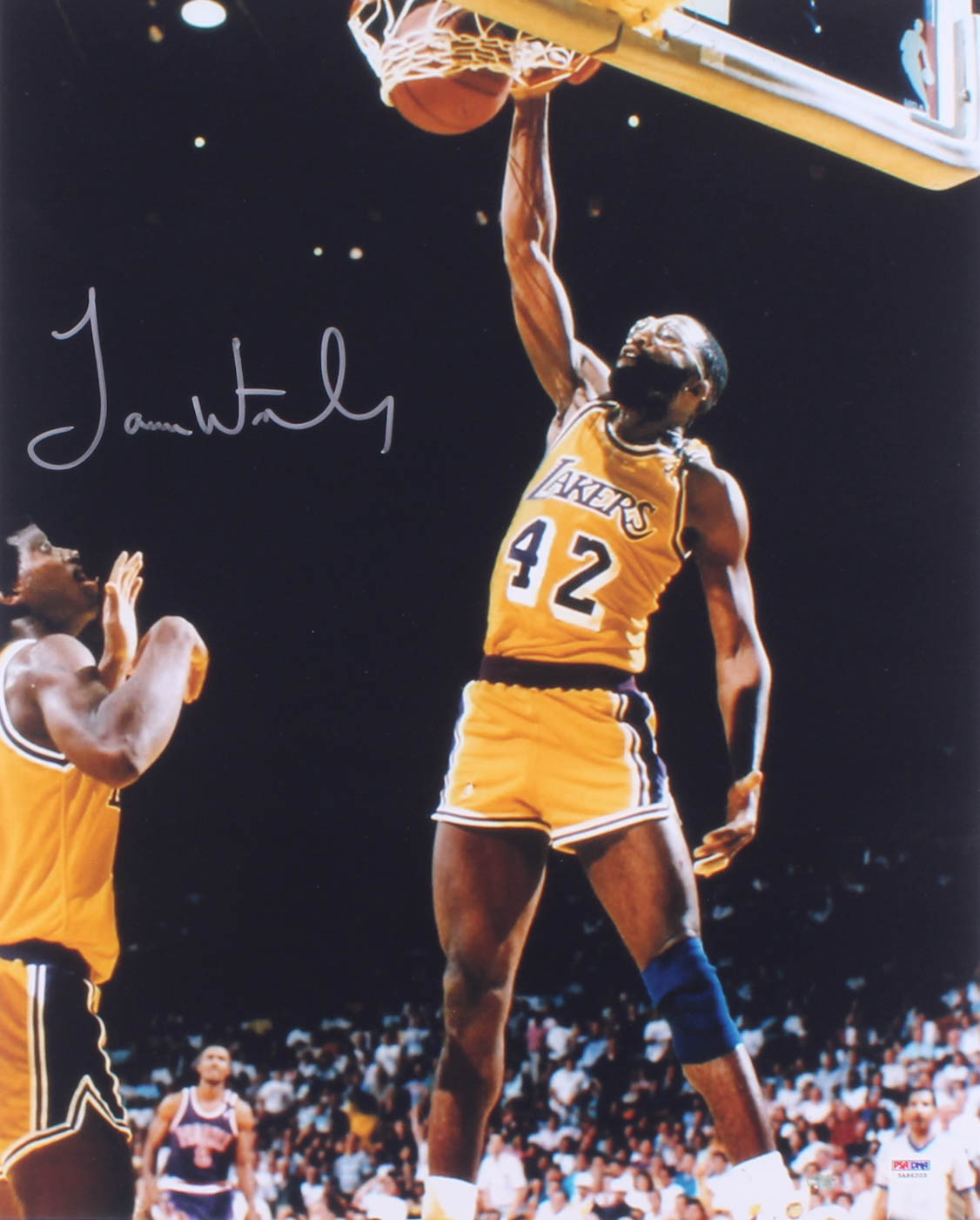 Photo measures 16" x 20" in size and has been hand-signed in silver paint pen by James Worthy (Los Angeles Lakers, HOF).