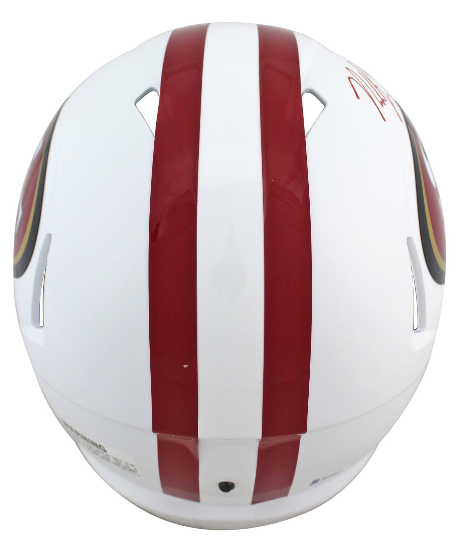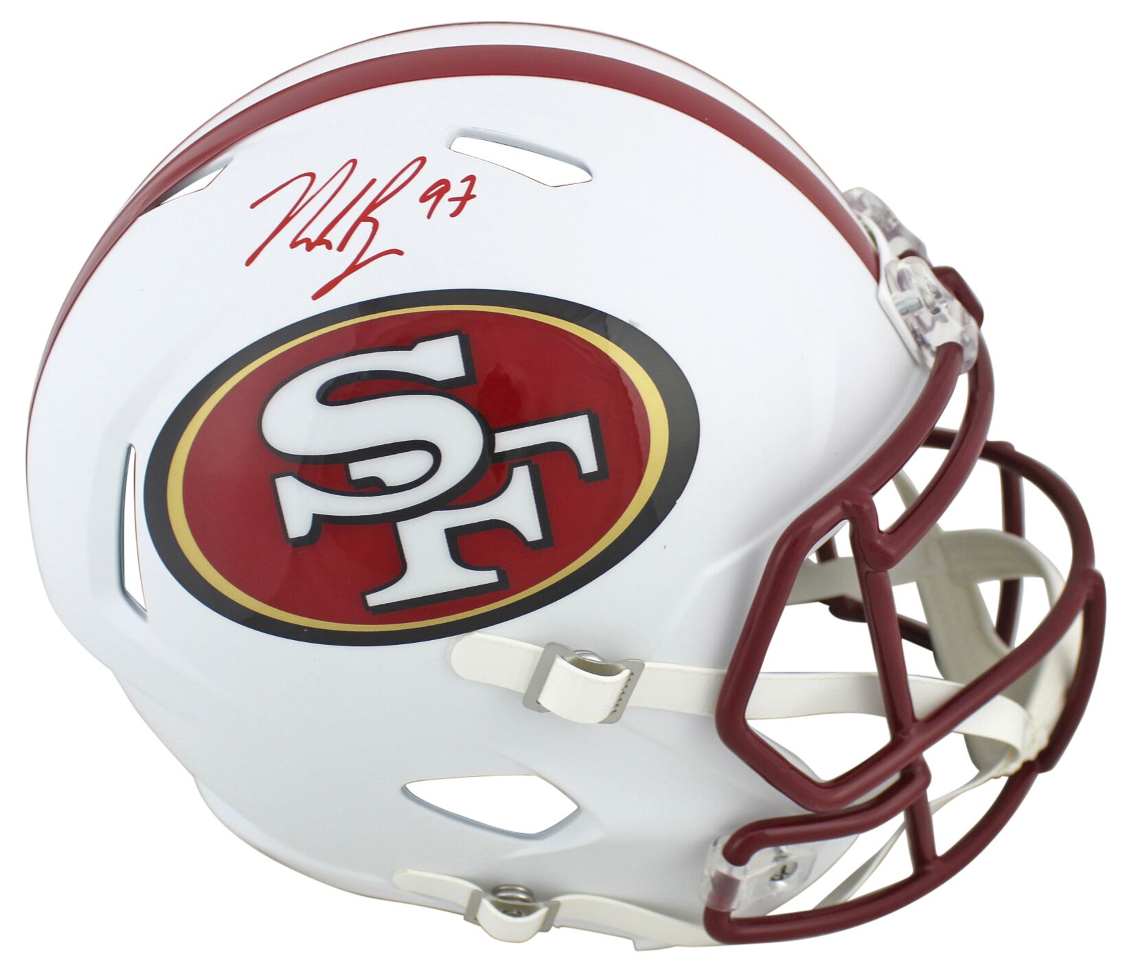 Riddell San Francisco 49ers full-size replica matte white Speed helmet. Hand-signed in red paint pen by Nick Bosa.