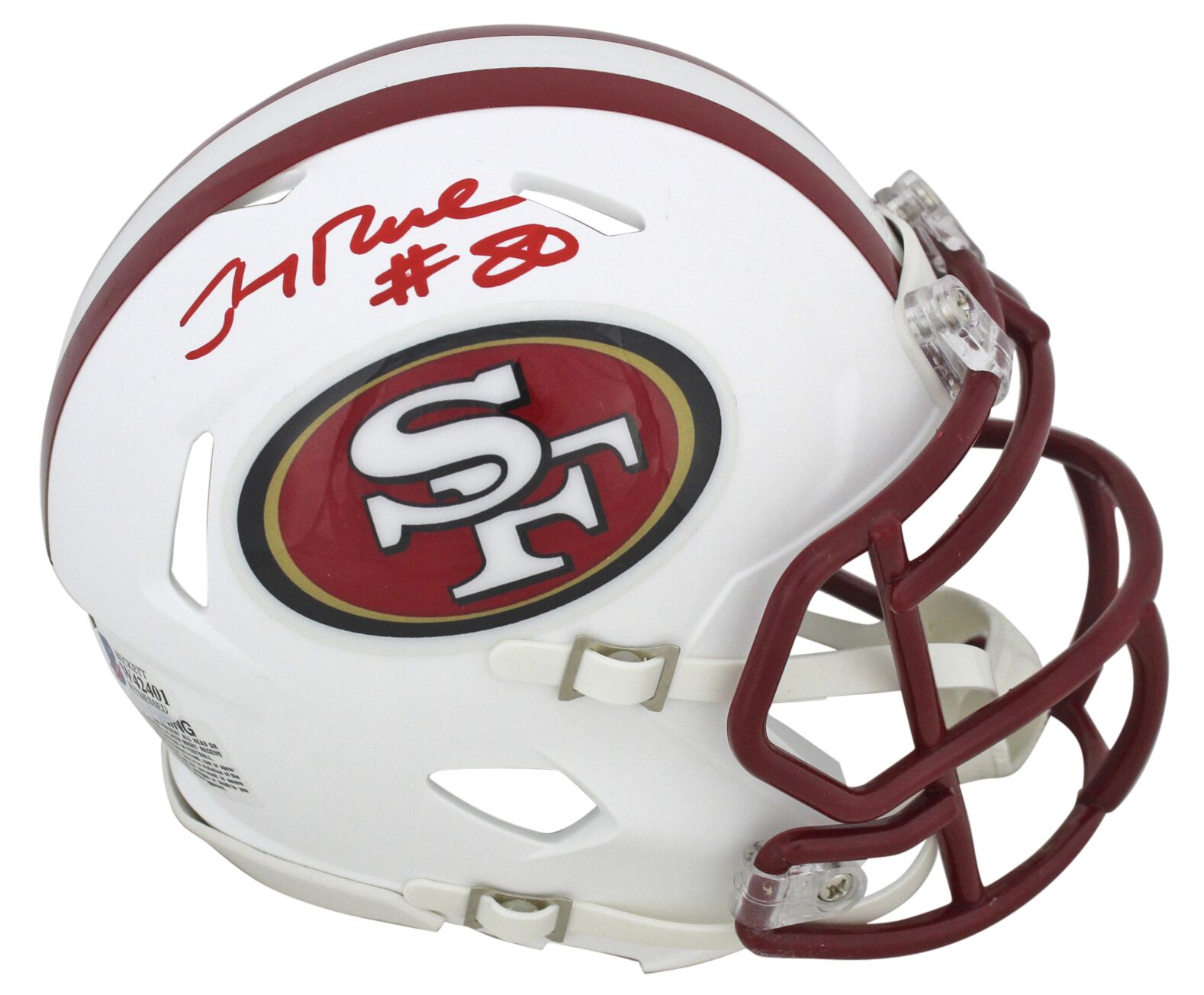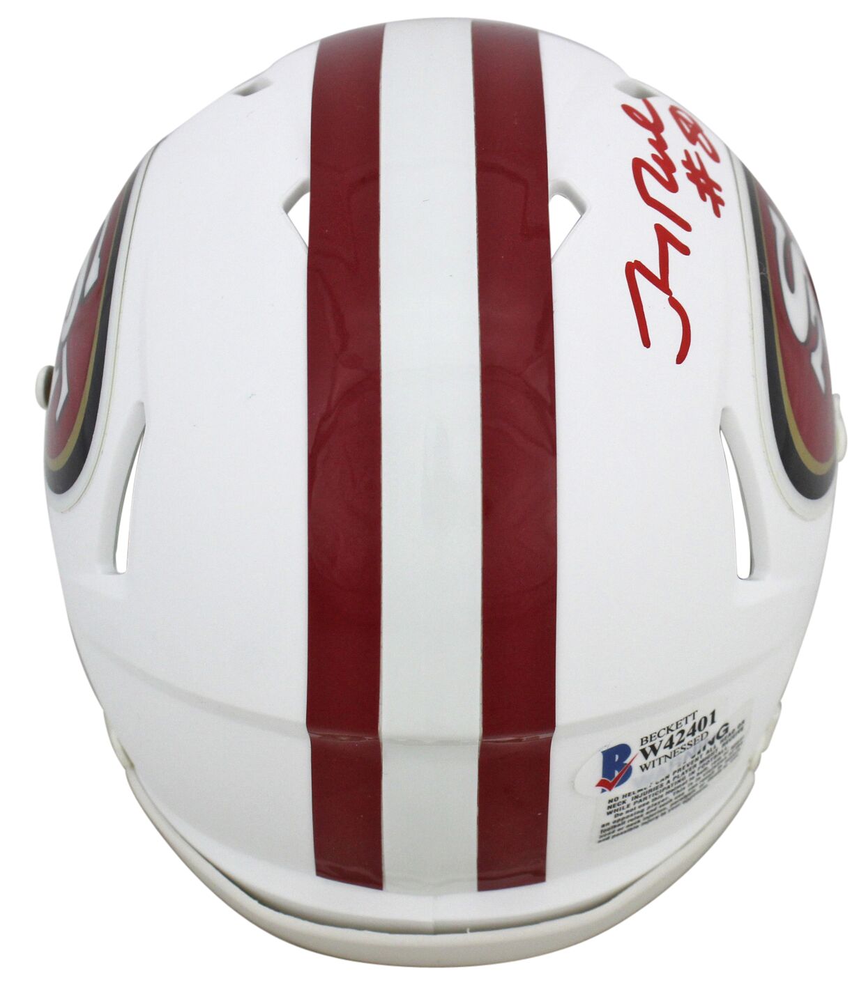 Riddell San Francisco 49ers Matte White Speed mini helmet. Hand-signed in red paint pen by Jerry Rice (HOF).