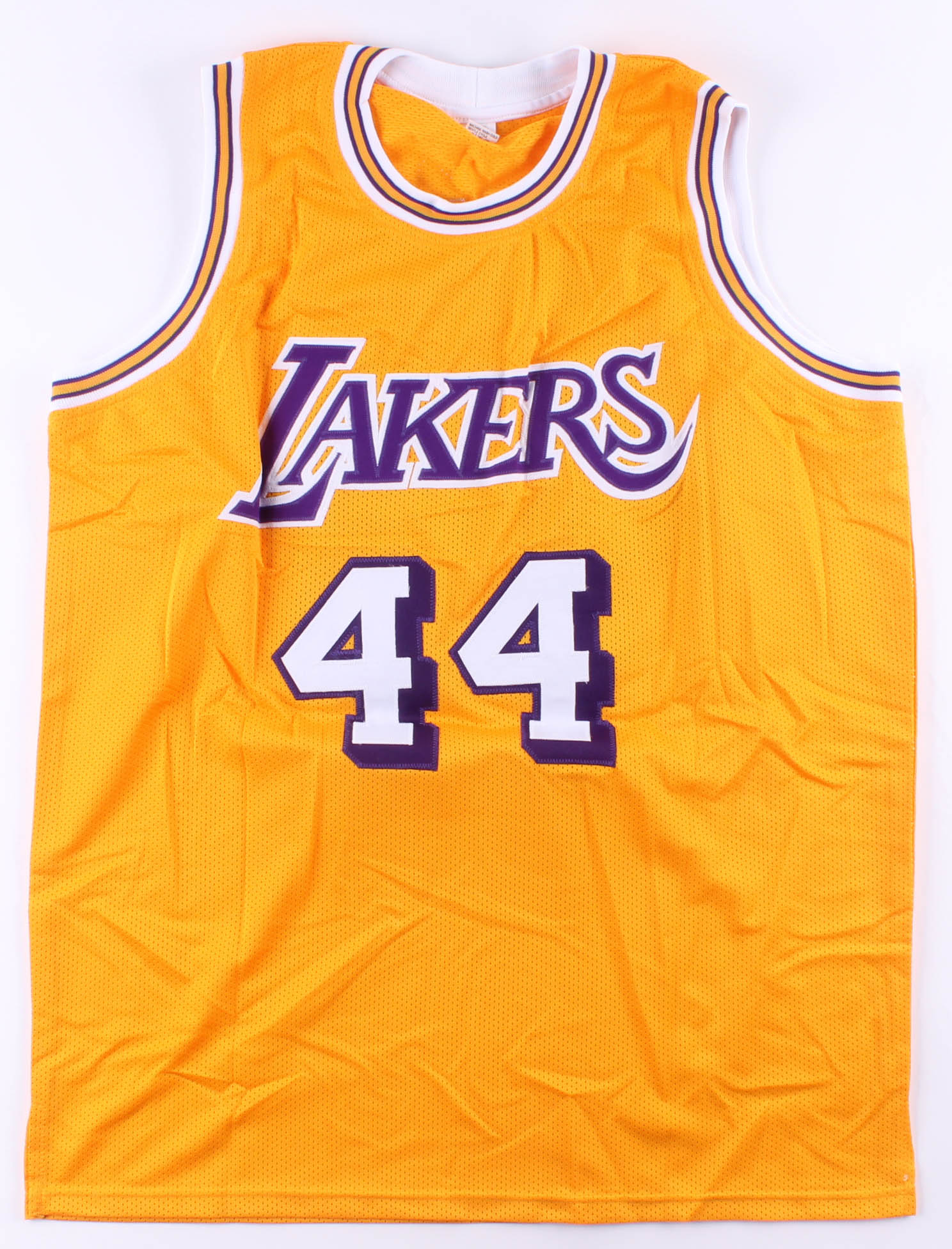 Custom on-court style jersey. Everything is sewn on, size XL. Hand-signed in black felt-tip by Jerry West (HOF).