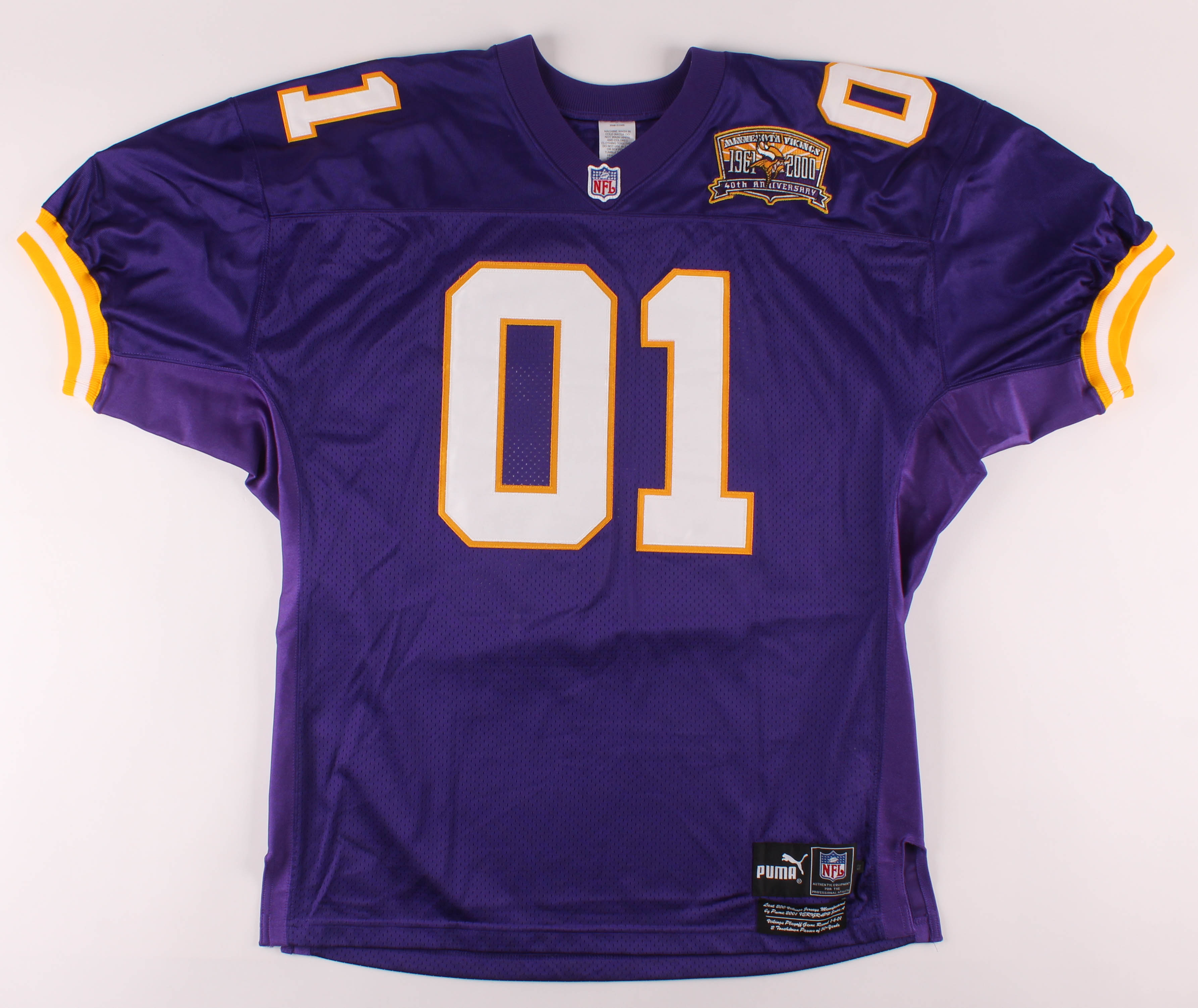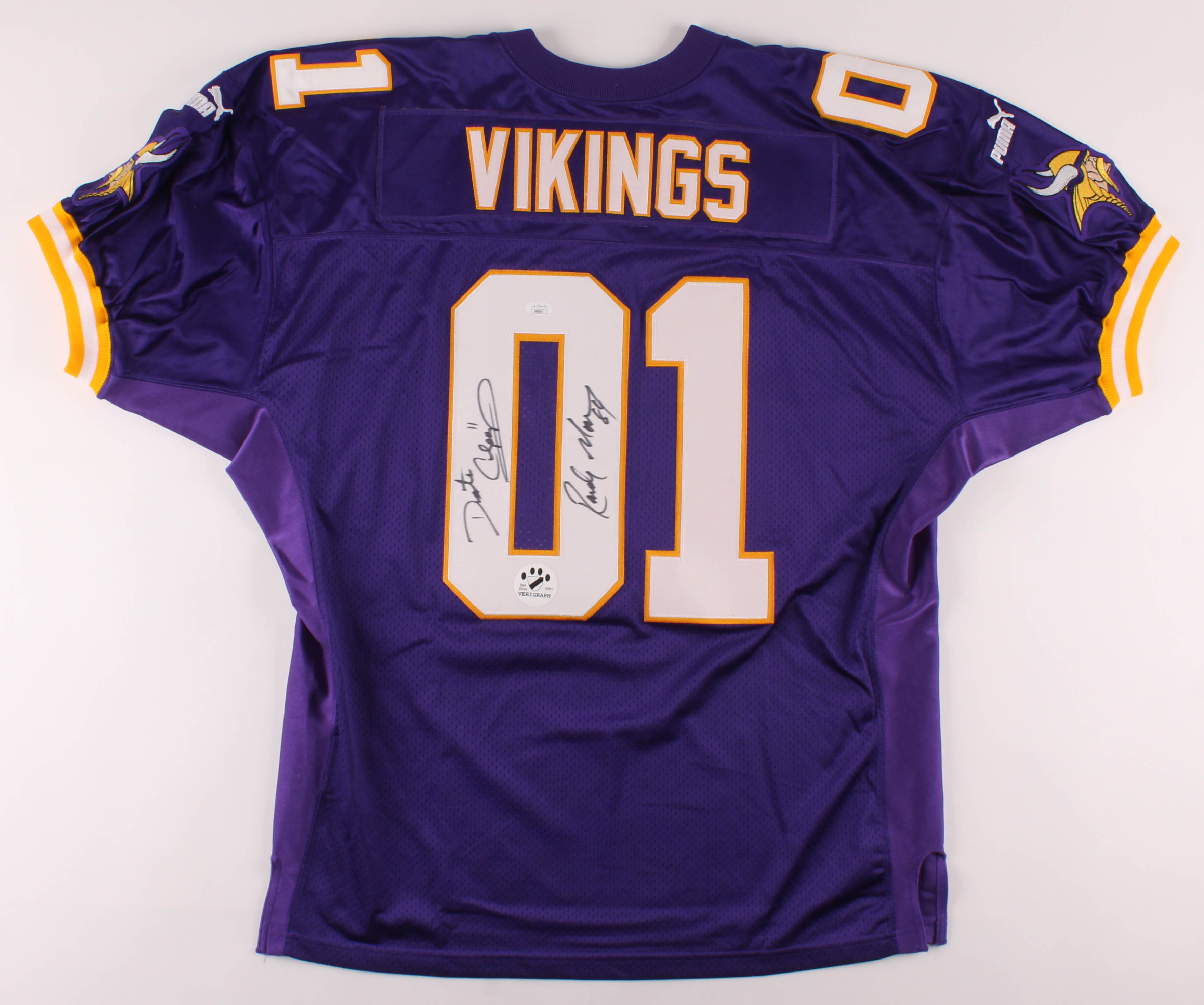 Puma NFL Official Minnesota Vikings 40th Anniversary on-field style jersey. Everything is sewn on, size XL. Hand-signed in black felt-tip pen by Randy Moss (HOF) and Daunte Culpepper.