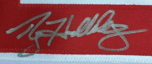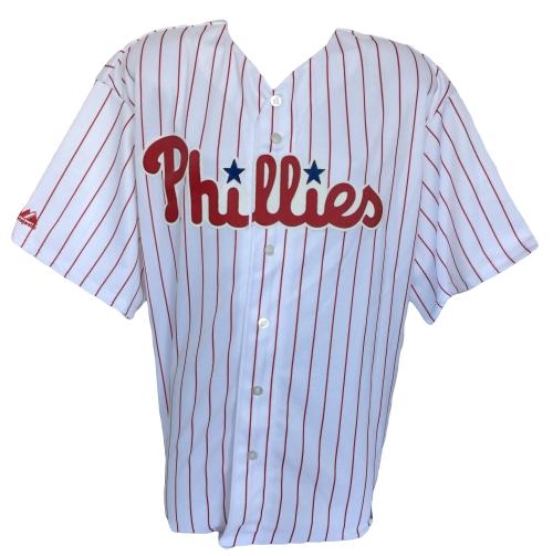 Majestic on-field style jersey. Everything is sewn on, size 2XL. Hand-signed in silver paint pen by Roy Halladay (D. 2017, Philadelphia Phillies, HOF).