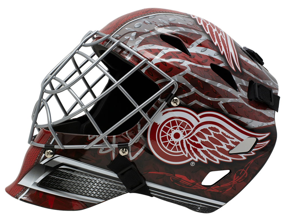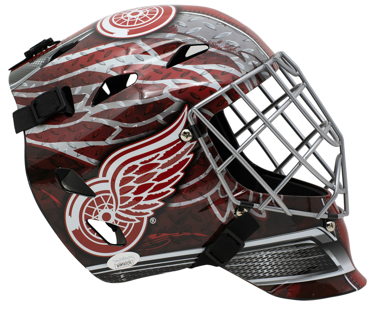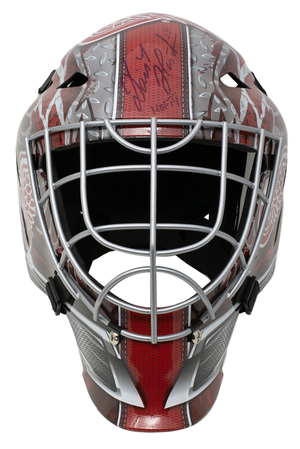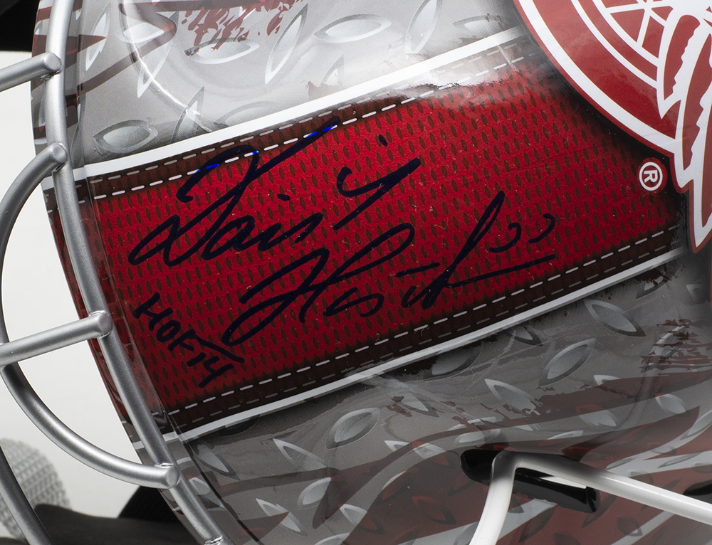 Detroit Red Wings full-size goalie mask. Hand-signed in black felt-tip pen by Dominik Hasek (Detroit Red Wings, HOF).