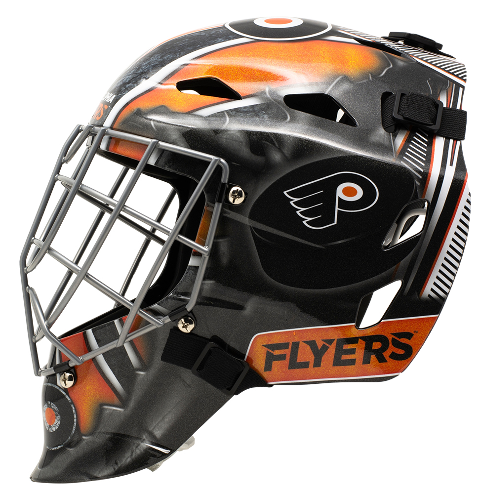 Franklin NHL Official Philadelphia Flyers full-size goalie mask. Hand-signed in gold paint pen by Carter Hart.