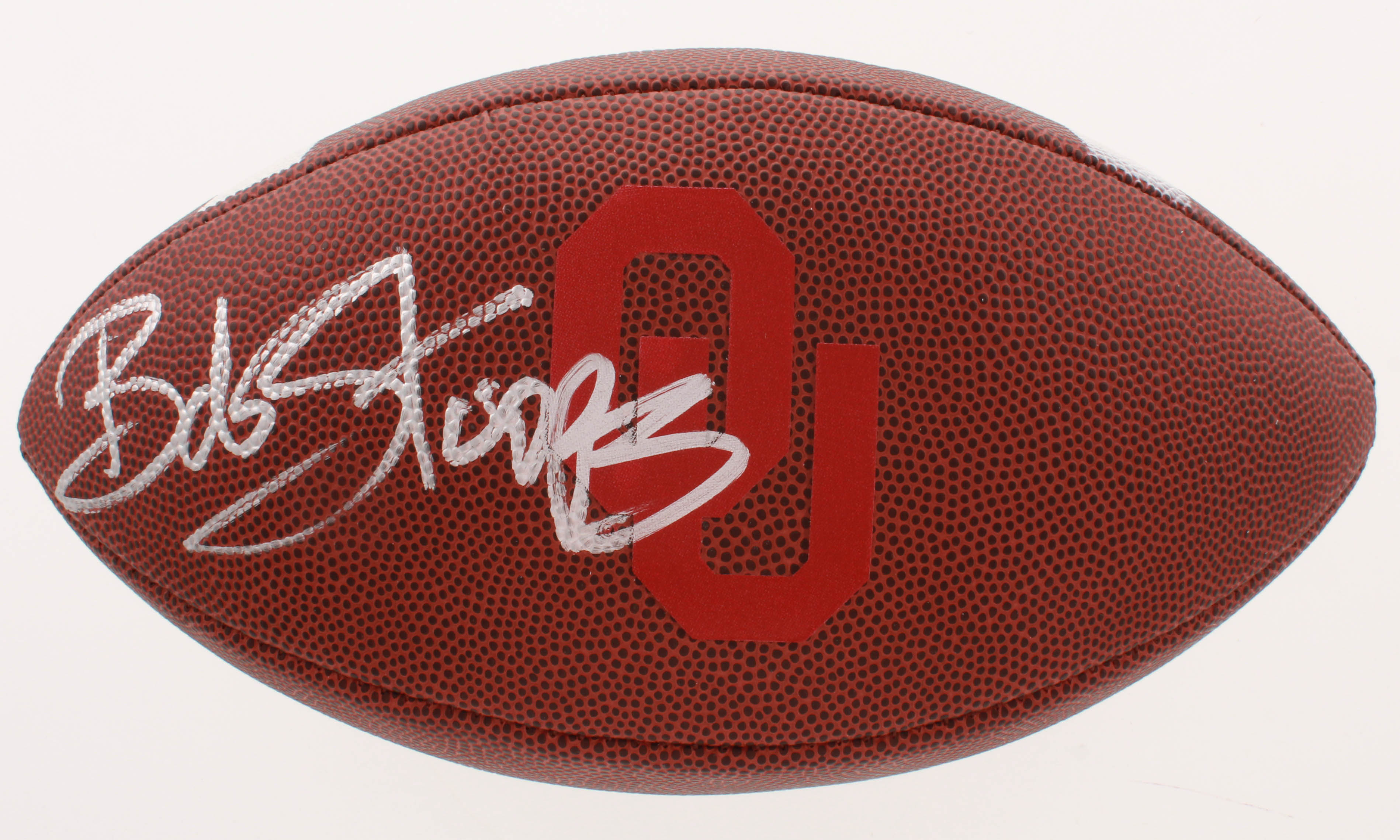 Wilson NCAA Oklahoma Sooners logo football has been hand-signed in silver paint pen by Bob Stoops. Please note, the ball does not hold air.