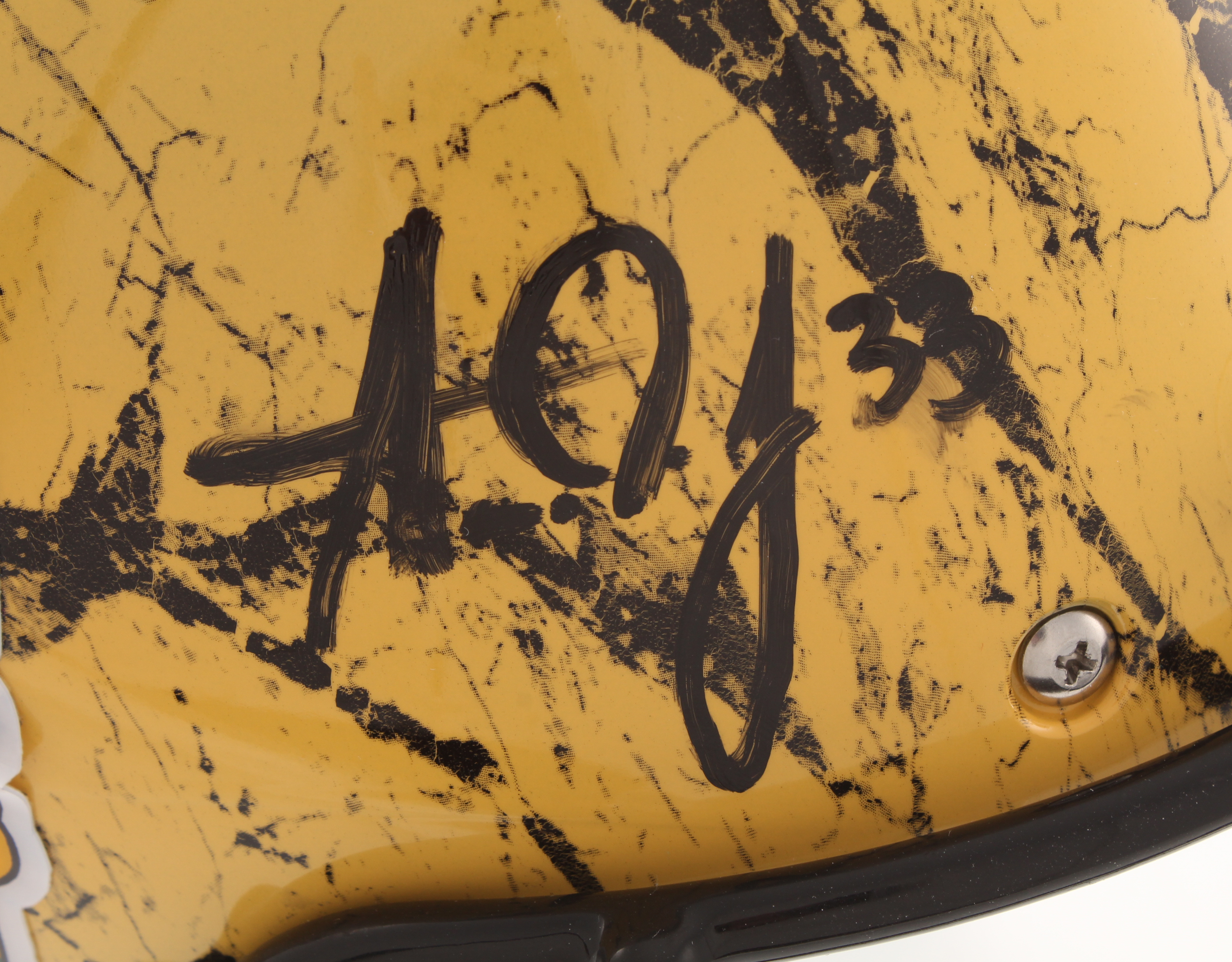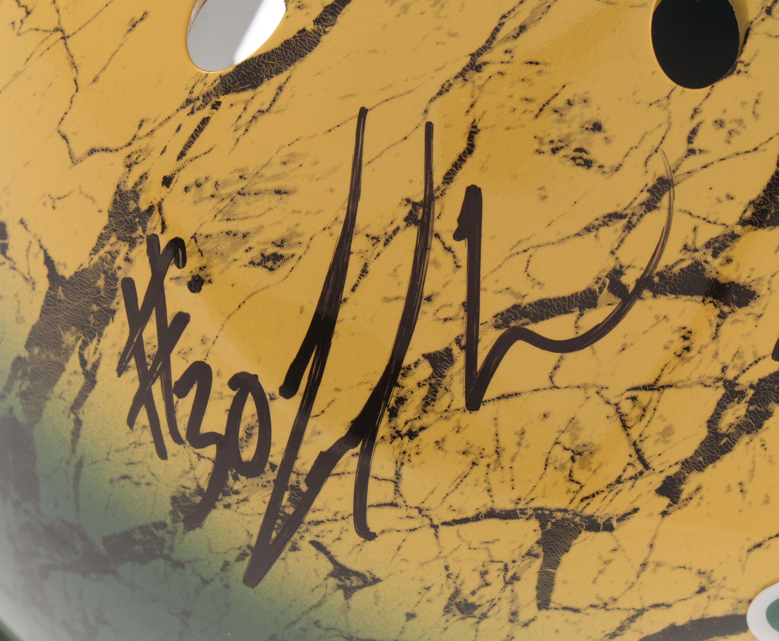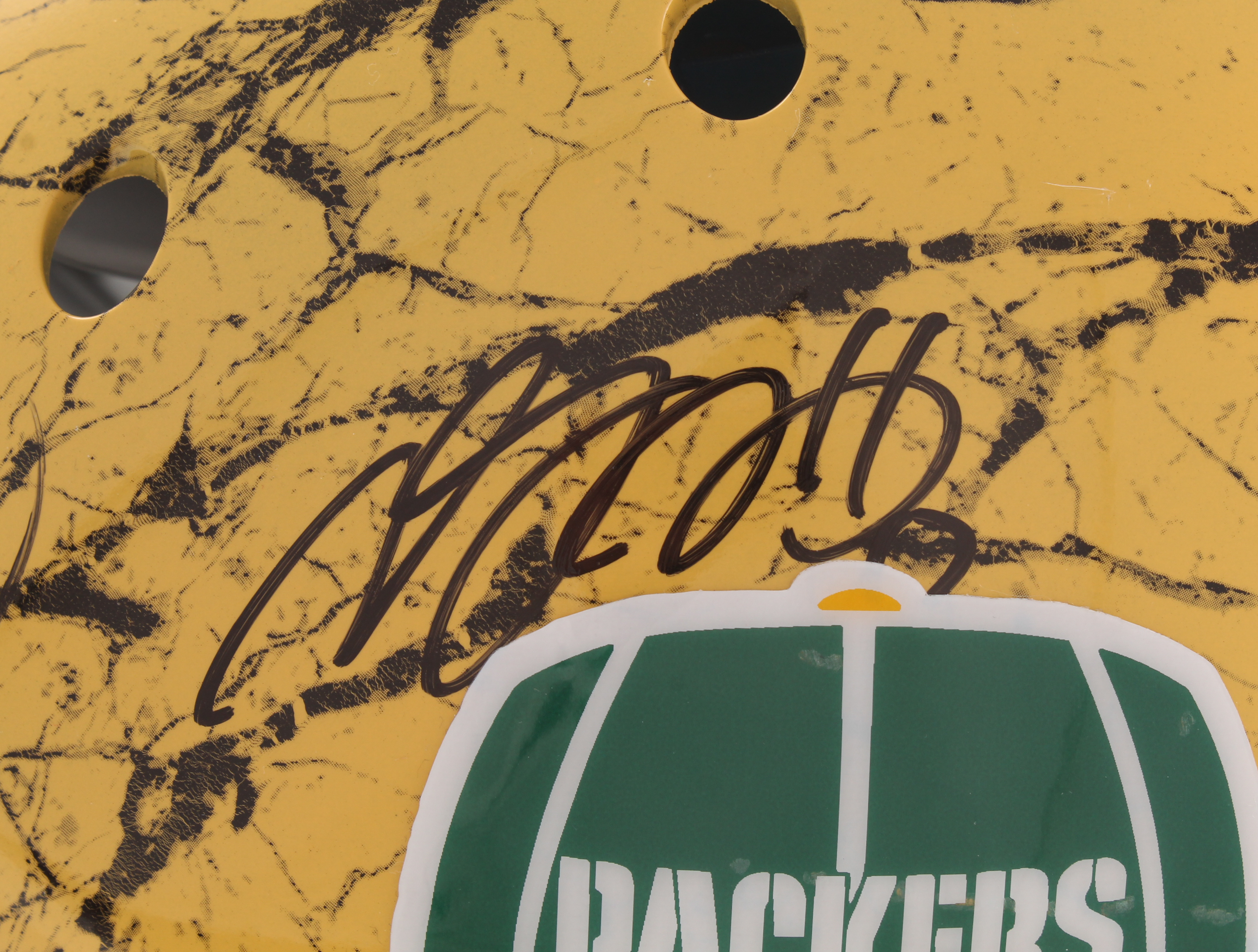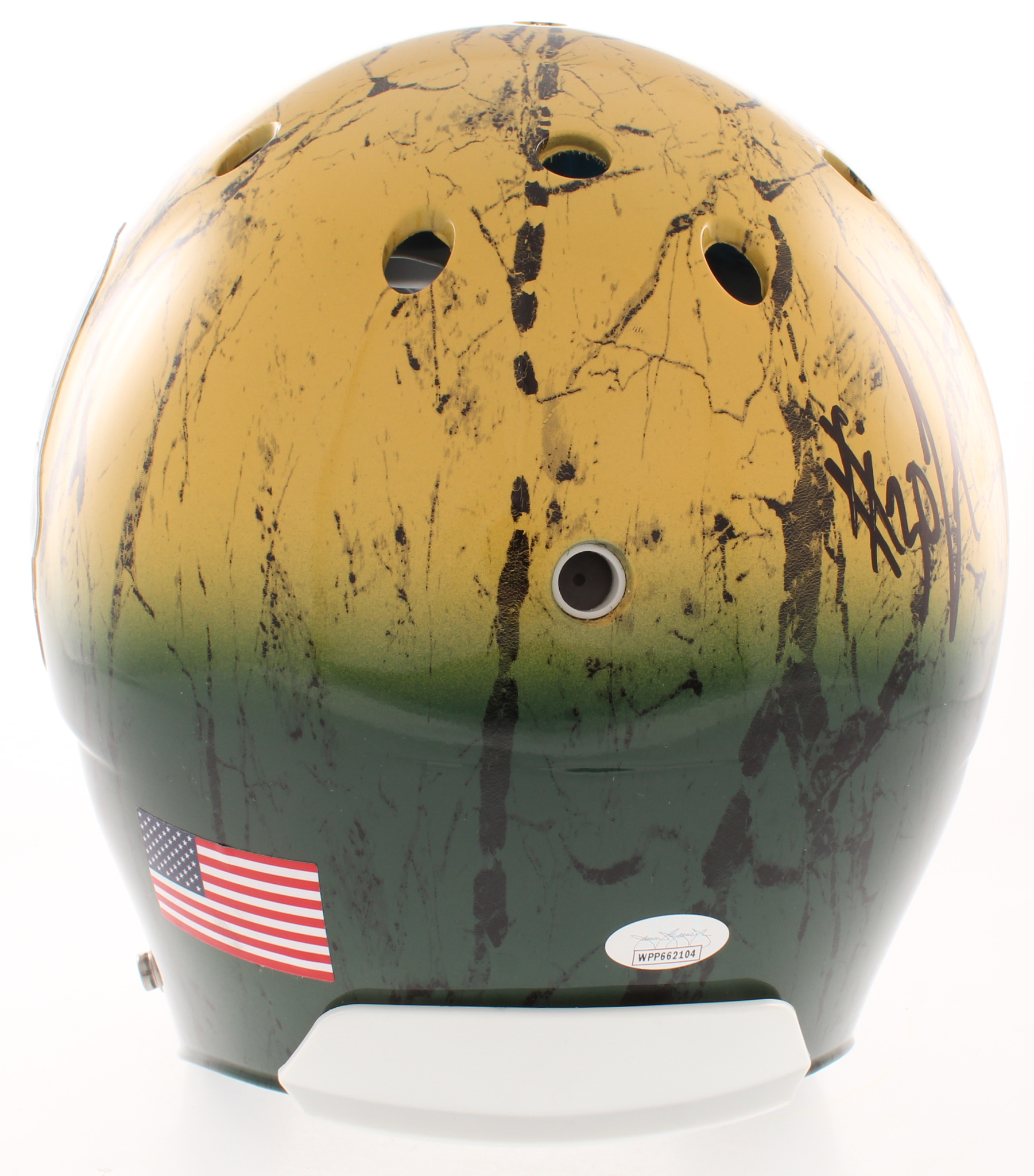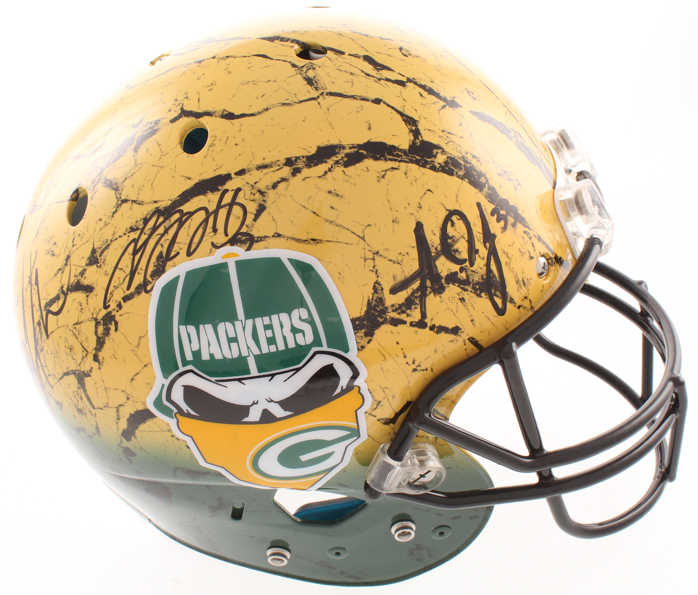 Schutt Green Bay Packers full-size authentic on-field hydro-dipped helmet. Hand-signed in black felt-tip pen by Davante Adams, Aaron Jones, and Jamal Williams.
