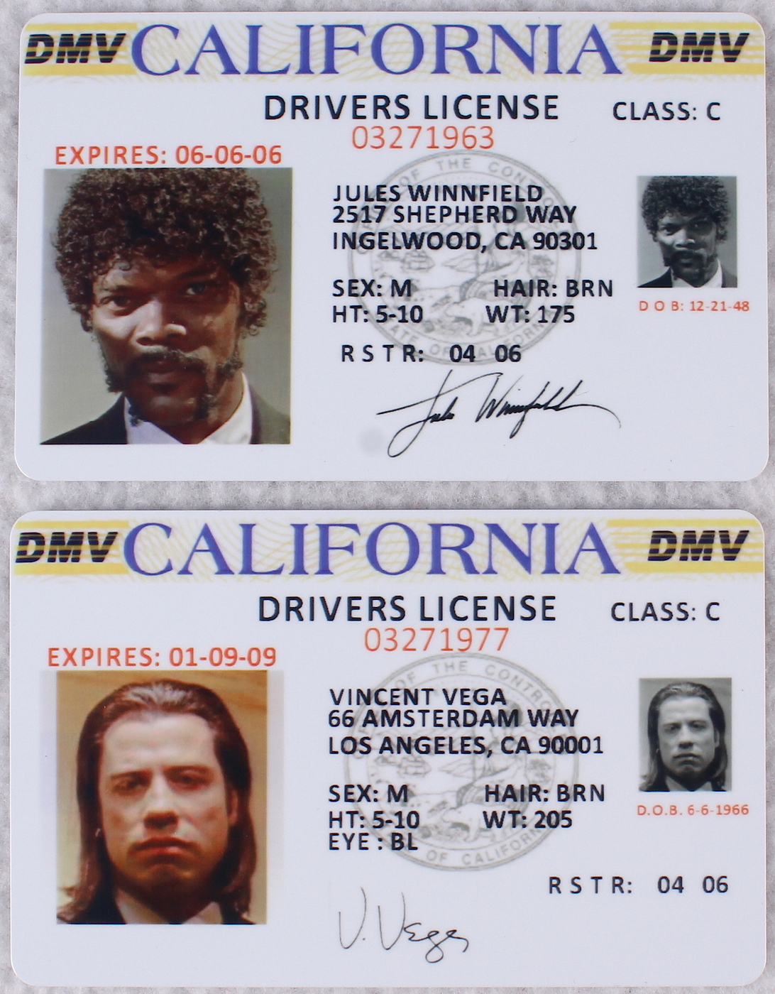 Jules Winnfield and Vincent Vega "Pulp Fiction" Replica Drivers License. The drivers license is a replica. See photos for more details.