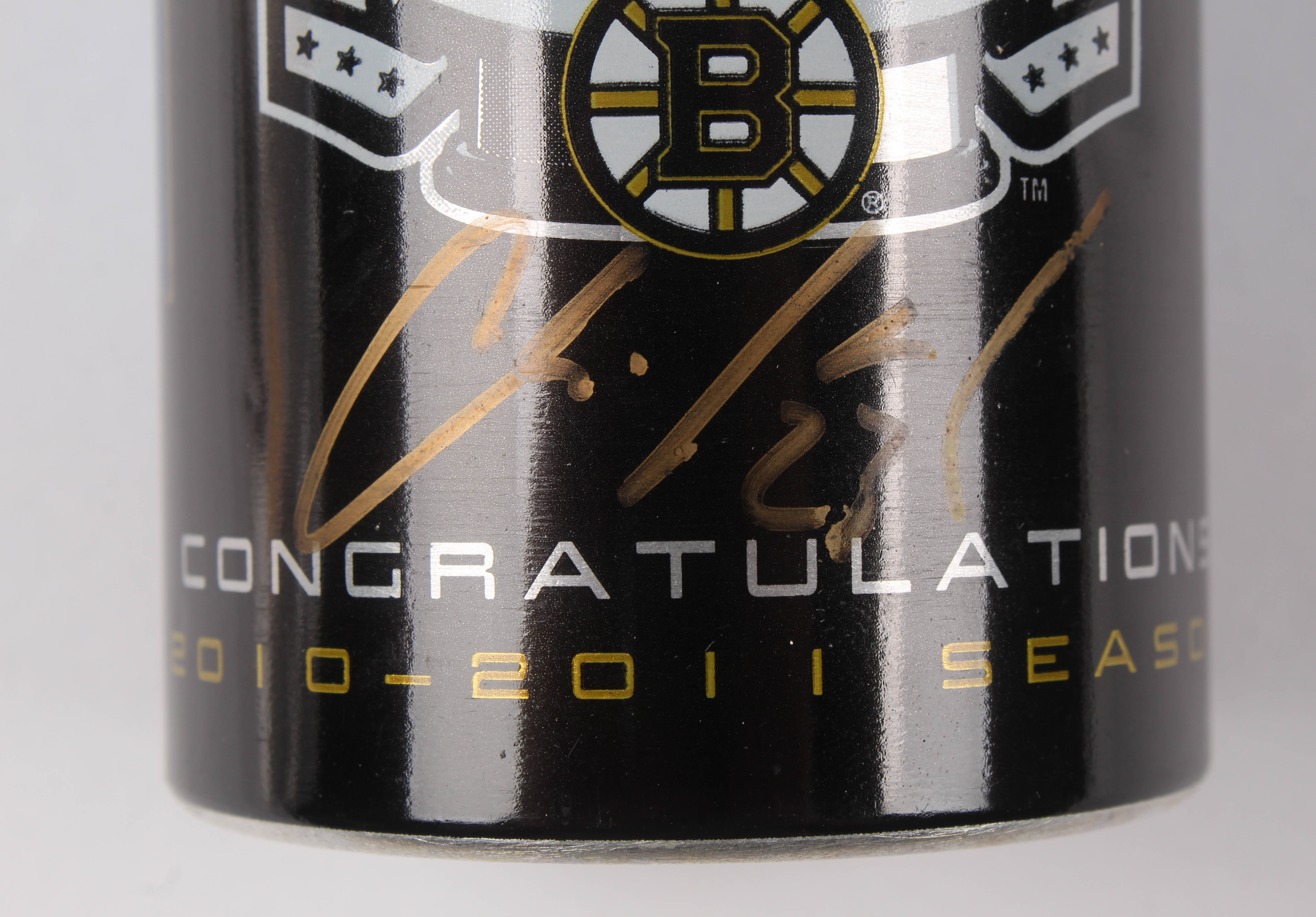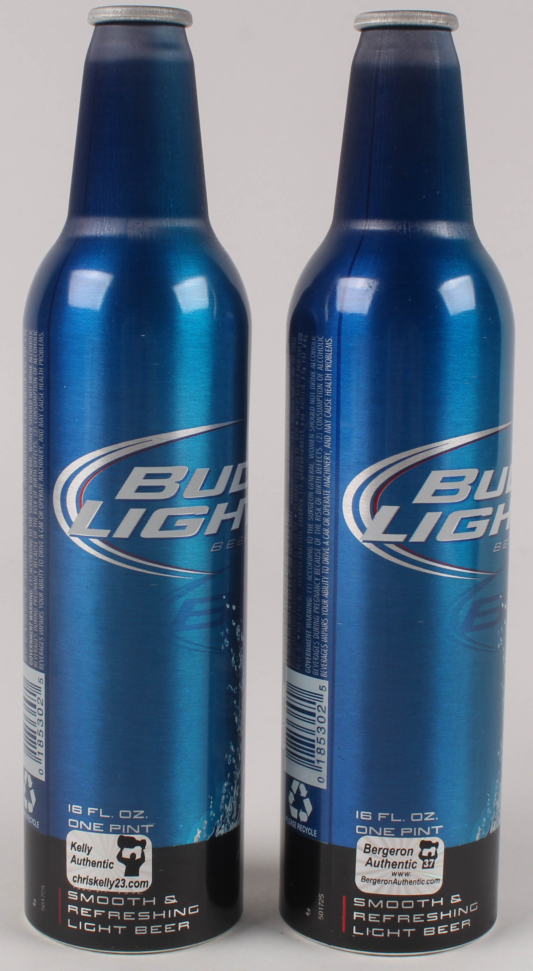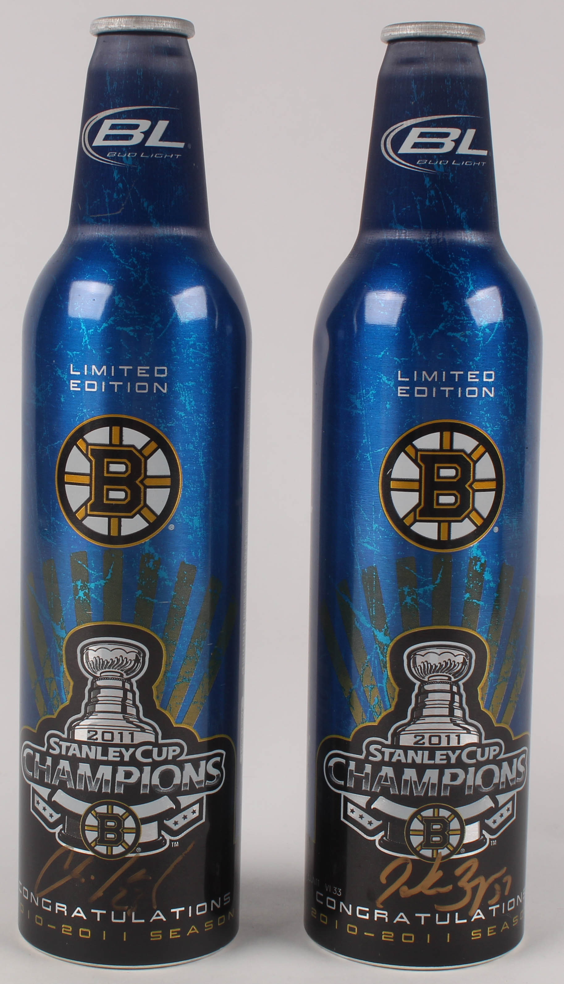 Lot includes both bottles shown. 2011 Stanley Cup Champions Bud Light beer bottles have been hand-signed in gold paint pen by Patrice Bergeron (Boston Bruins) and Chris Kelly (Boston Bruins).