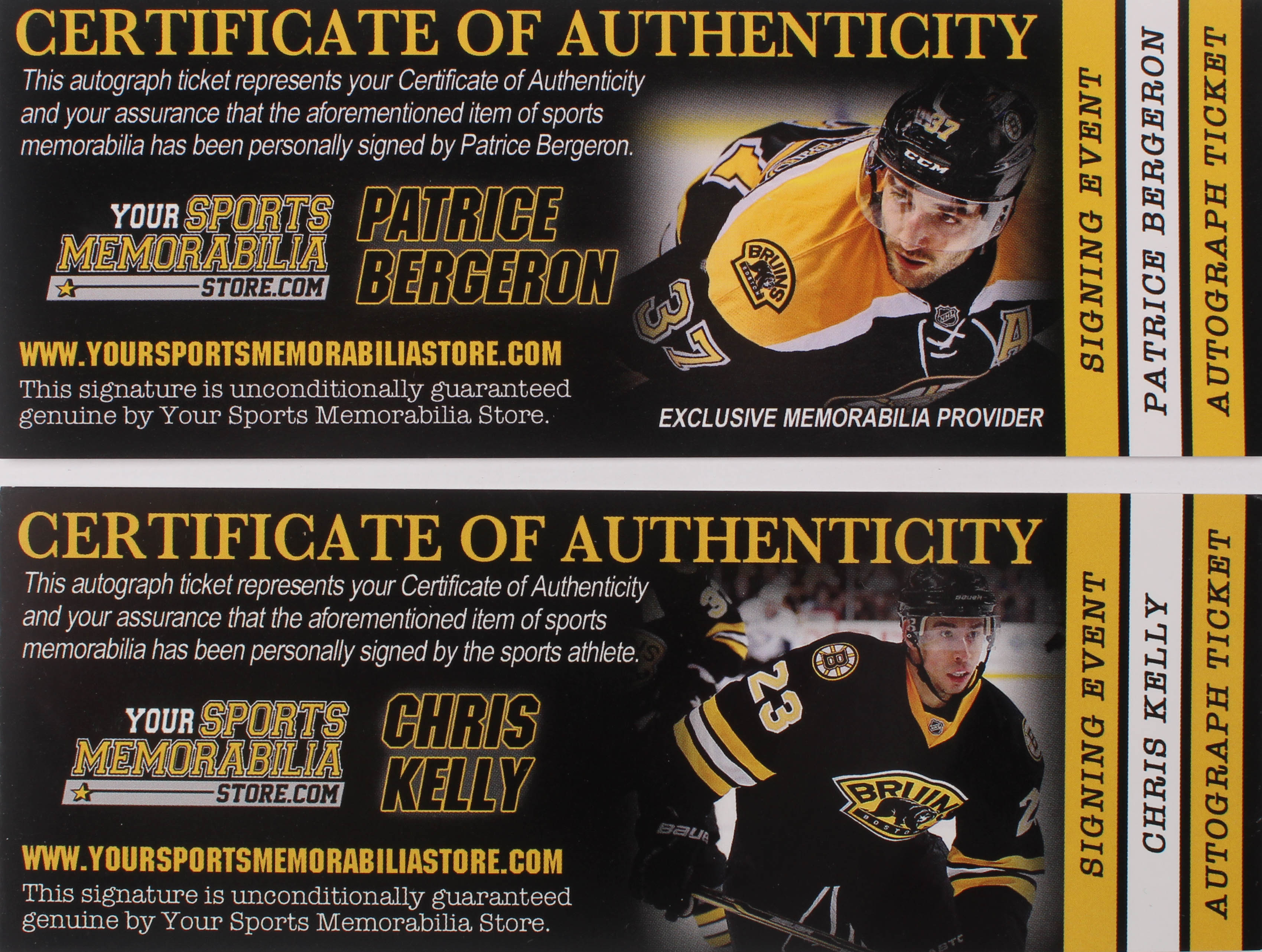 The lot / autograph(s) includes official Your Sports Memorabilia Store Patrice Bergeron & Chris Kelly holograms and COAs for authenticity purposes.