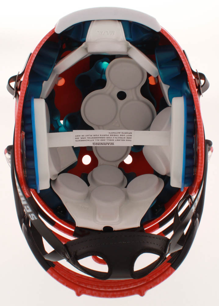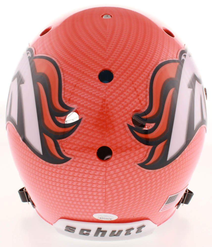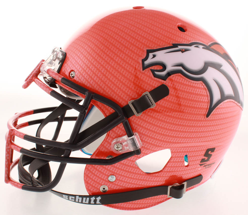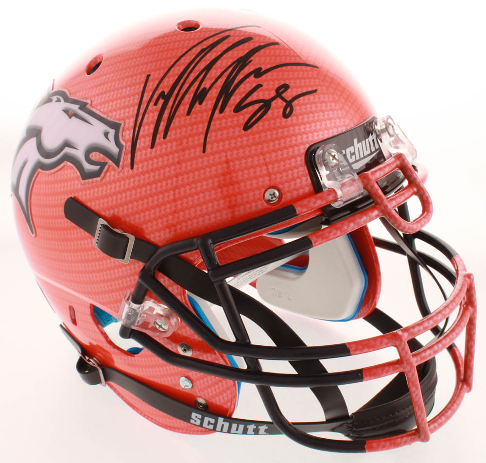 Schutt Denver Broncos Full-size Authentic On-field Hydro-Dipped helmet has been hand-signed in black felt-tip pen by Von Miller.