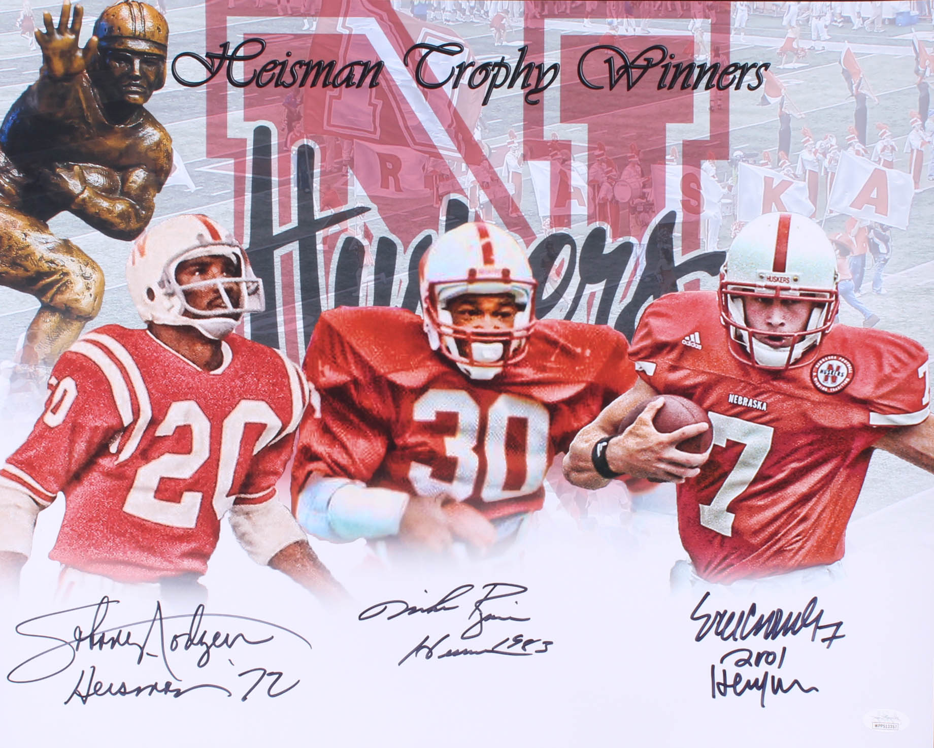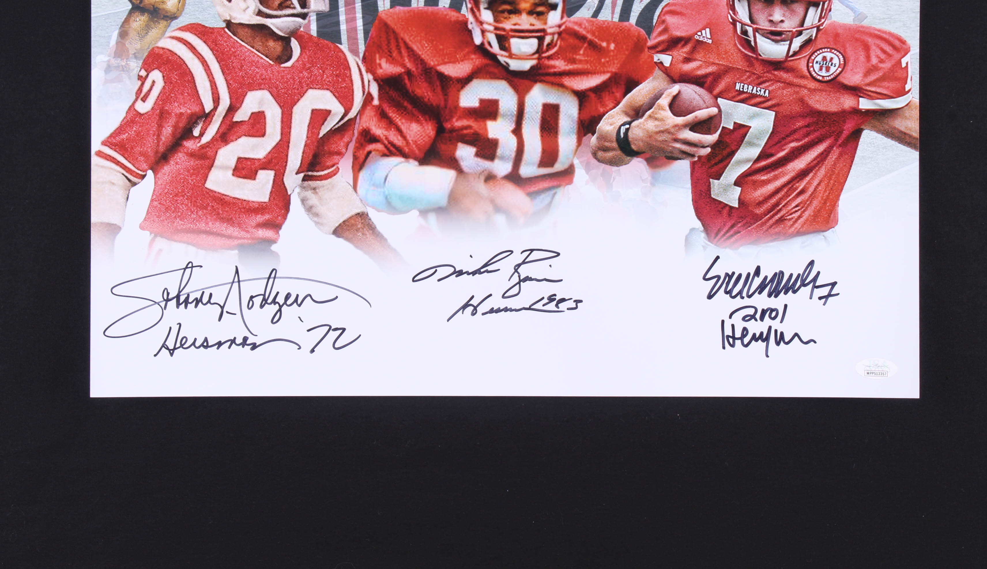 Johnny Rodgers, Mike Rozier & Eric Crouch Signed Nebraska Cornhuskers 16x20 Photo Inscribed "Heisman 72", "Heisman 1983" & "2001 Heisman" (JSA COA)
