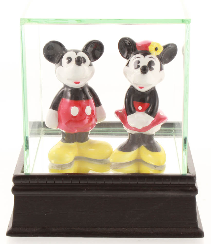 Vintage 1970's Ceramic Mickey & Minnie Mouse Figurines with Display Case