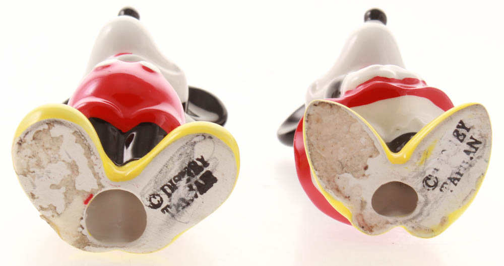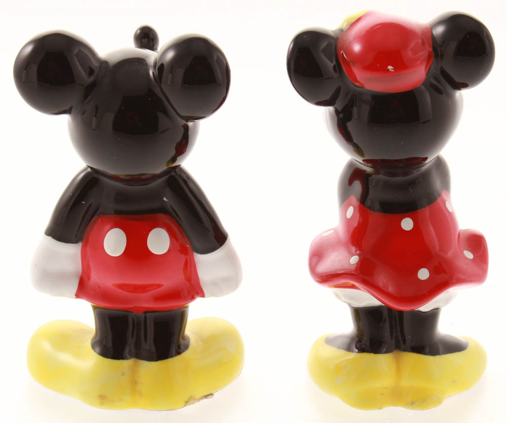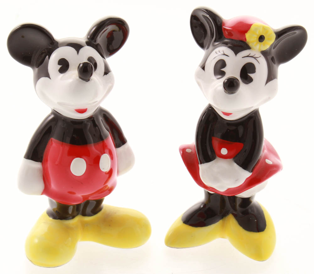 Vintage 1970's ceramic Mickey and Minnie Mouse figurines measure approximately 4" in size. Figurines include display case as shown.