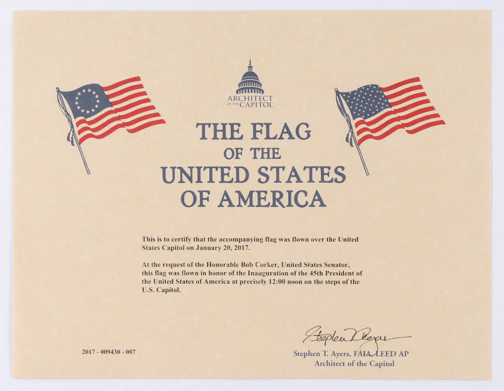 This flag was flown at the request of the Honorable Bob Corker, United States Senator, on the occasion of the Inauguration of Donald John Trump at noon local time and being sworn in by Chief Justice John Roberts of the U.S. Supreme Court as America's 45th President.