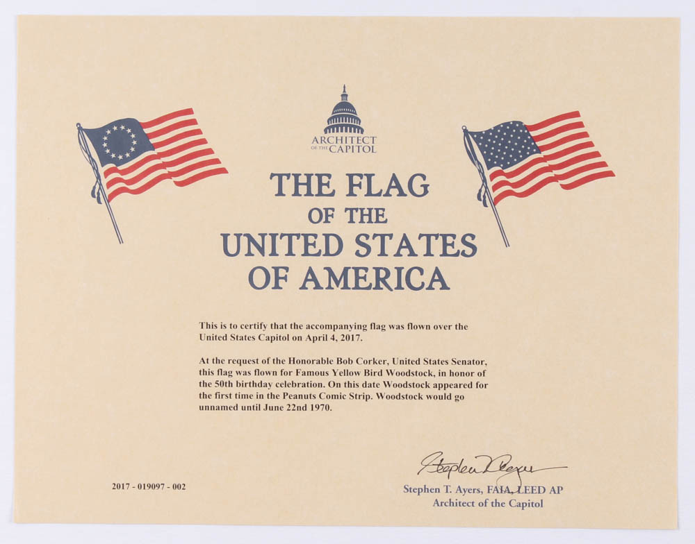 This flag was flown at the request of the Bob Corker, United States Senator, for Famous Yellow Bird Woodstock, in honor of the 50th birthday celebration. On this date Woodstock appeared for the first time in the Peanuts Comic Strip. Woodstock would go unnamed until June 22nd, 1970.