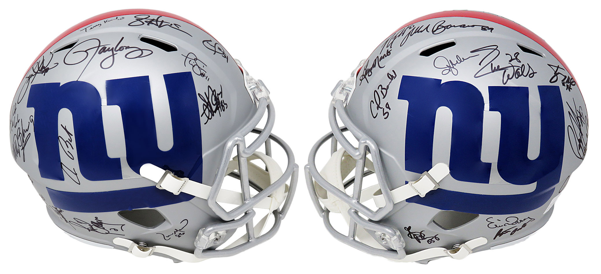 Riddell New York Giants AMP Alternate full-size replica Speed helmet. Hand-signed in black felt-tip pen by (28) including Phil Simms, Lawrence Taylor, Jeff Hostetler, Mark Bavaro, Leonard Marshall, Carl Banks, Pepper Johnson, Ottis Anderson, Bart Oates, Perry Williams, Lionel Manuel, Raul Allegre, Eric Dorsey, Mark Collins, William Roberts, Gary Reasons, Joe Morris, Jim Burt, Jeff Rutledge, Terry Kinard, George Martin, Elvis Patterson, Kenny Hill, Tony Galbreath, Stephen Baker, Rodney Hampton, Matt Bahr and Everson Walls.