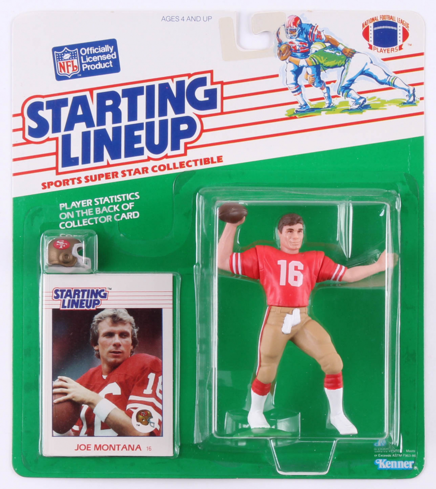 Kenner Starting Lineup Joe Montana action figure measures approximately 4" in height. The packaging also includes a 1988 Kenner Starting Lineup Cards #101 Joe Montana football card. Please note that the item is unsigned.