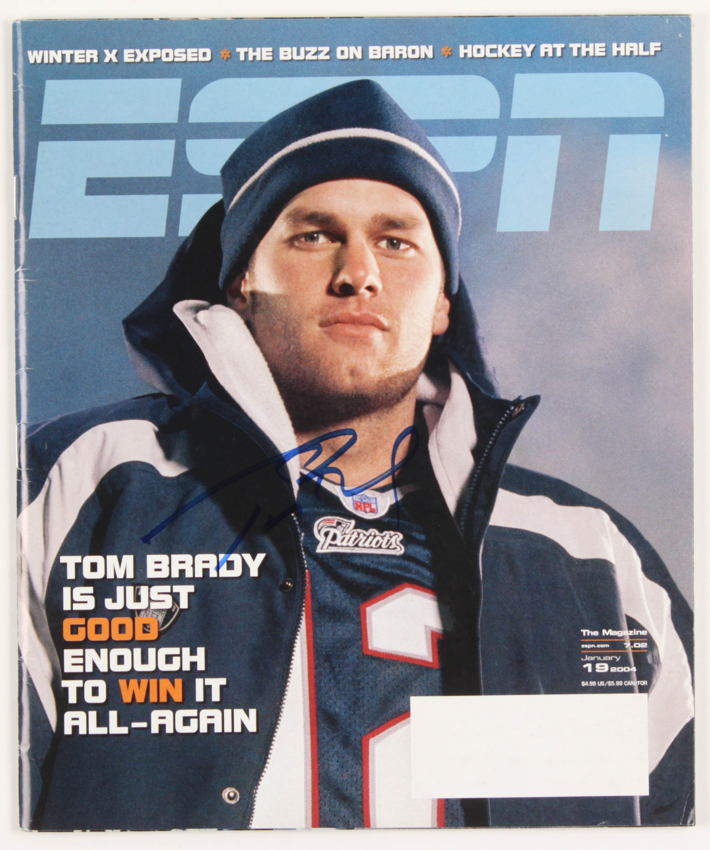 January 19, 2004 issue of ESPN Magazine has been hand-signed on the cover in blue felt-tip pen by Tom Brady (New England Patriots).