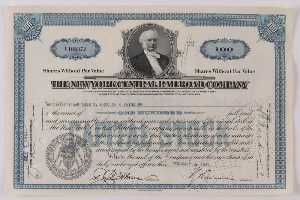 Vintage 1941 "The New York Central Railroad Company" (100) Shares Stock Certificate