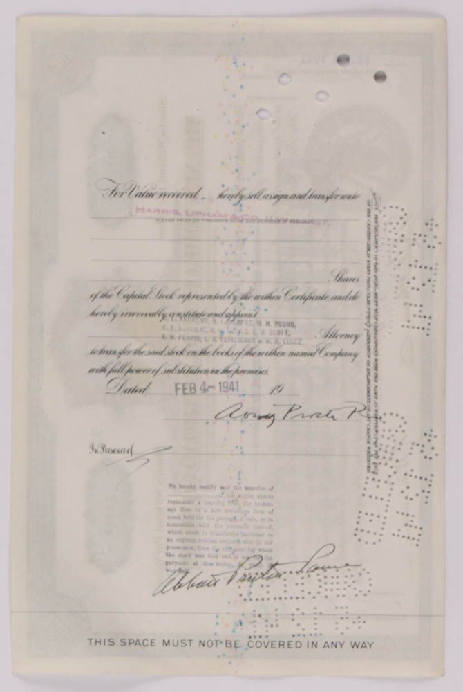 Vintage 1941 stock certificate valued for (100) shares. Please see photos for more details regarding the condition of the certificate.