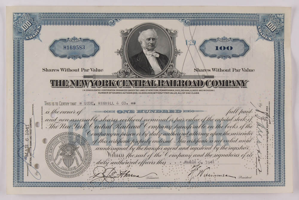 Vintage 1941 "The New York Central Railroad Company" (100) Shares Stock Certificate
