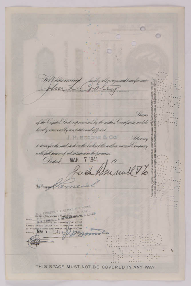 Vintage 1941 stock certificate valued for (100) shares. Please see photos for more details regarding the condition of the certificate.