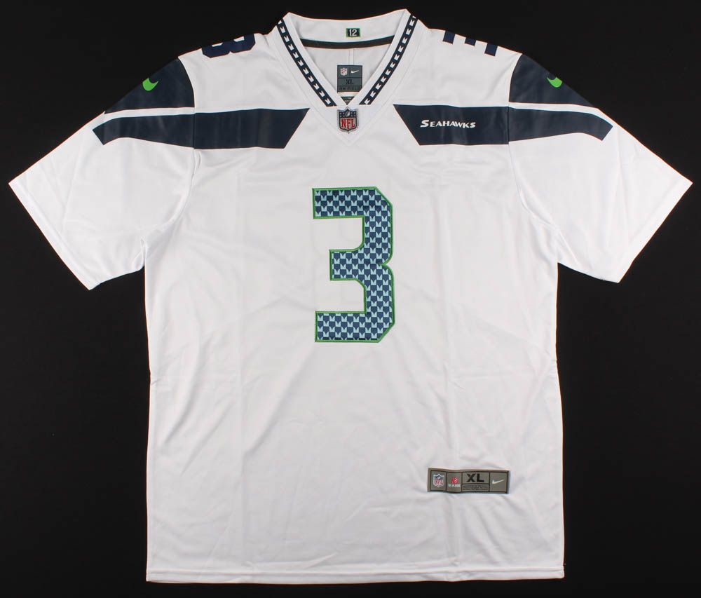 Nike on-field style jersey. Everything is sewn on, size XL. Hand-signed in black felt-tip pen by Russell Wilson (Seattle Seahawks).