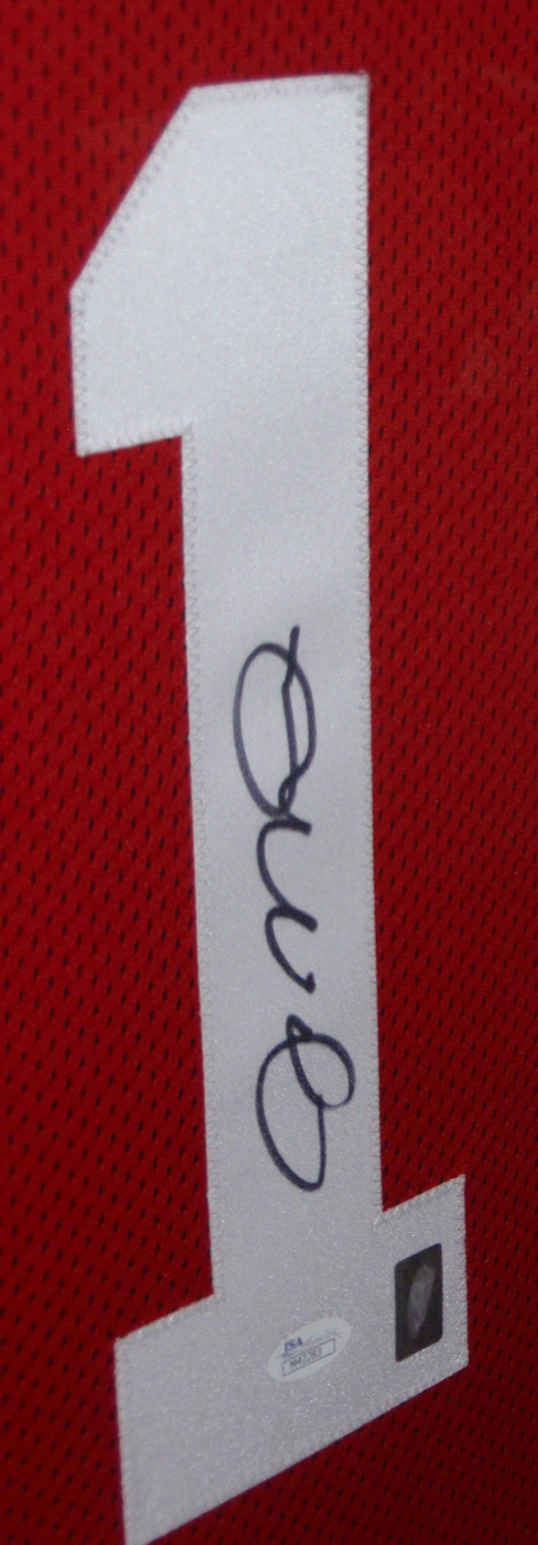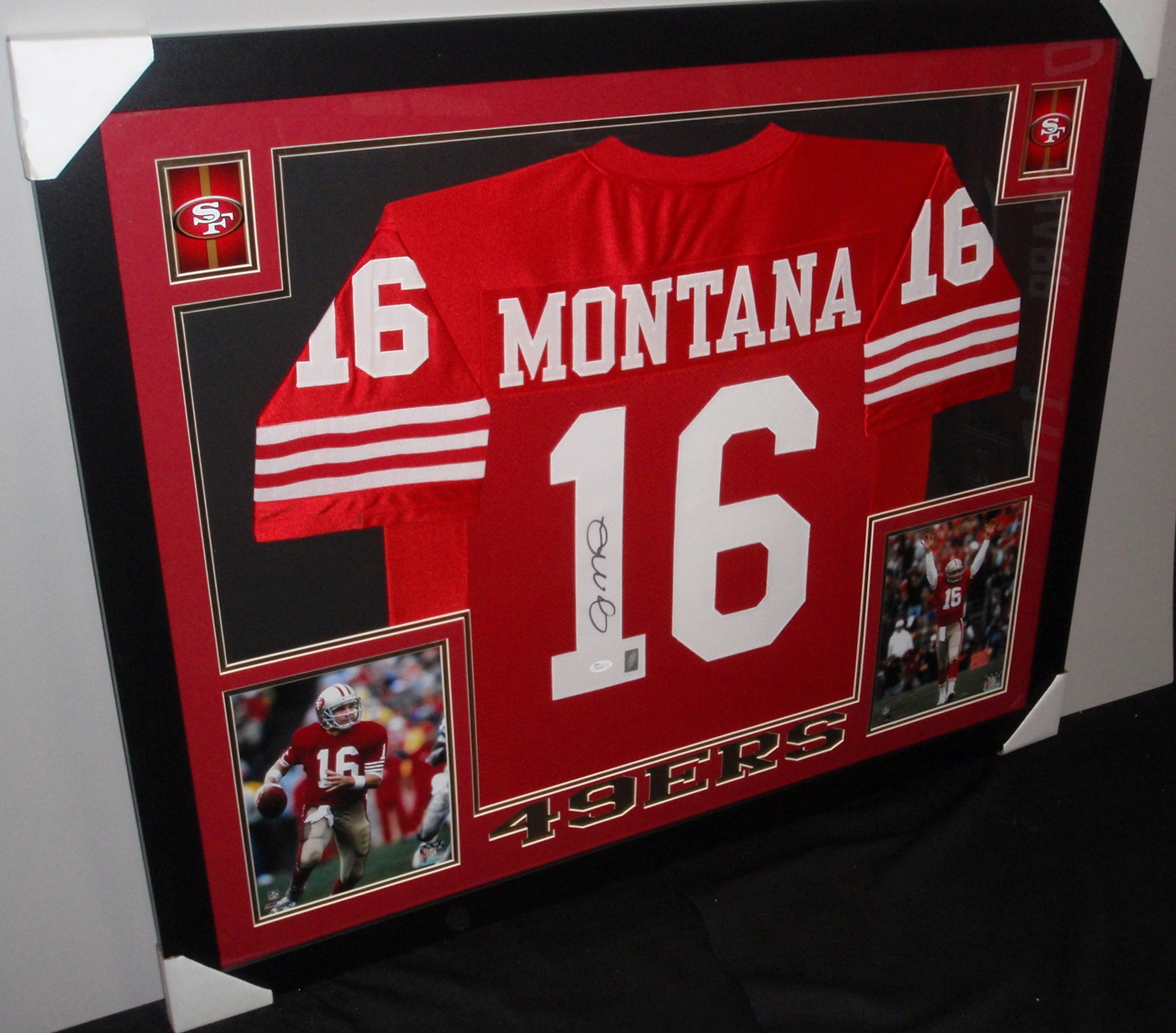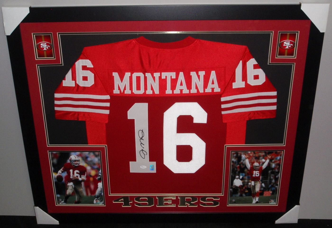 Custom frame measures approximately 35" x 43" in size and features a jersey which has been hand-signed in black felt-tip pen by Joe Montana (49ers HOF). The autograph includes an official Joe Montana player hologram from GT Sports Marketing and James Spence Authentication (JSA) hologram with matching COA for authenticity purposes.