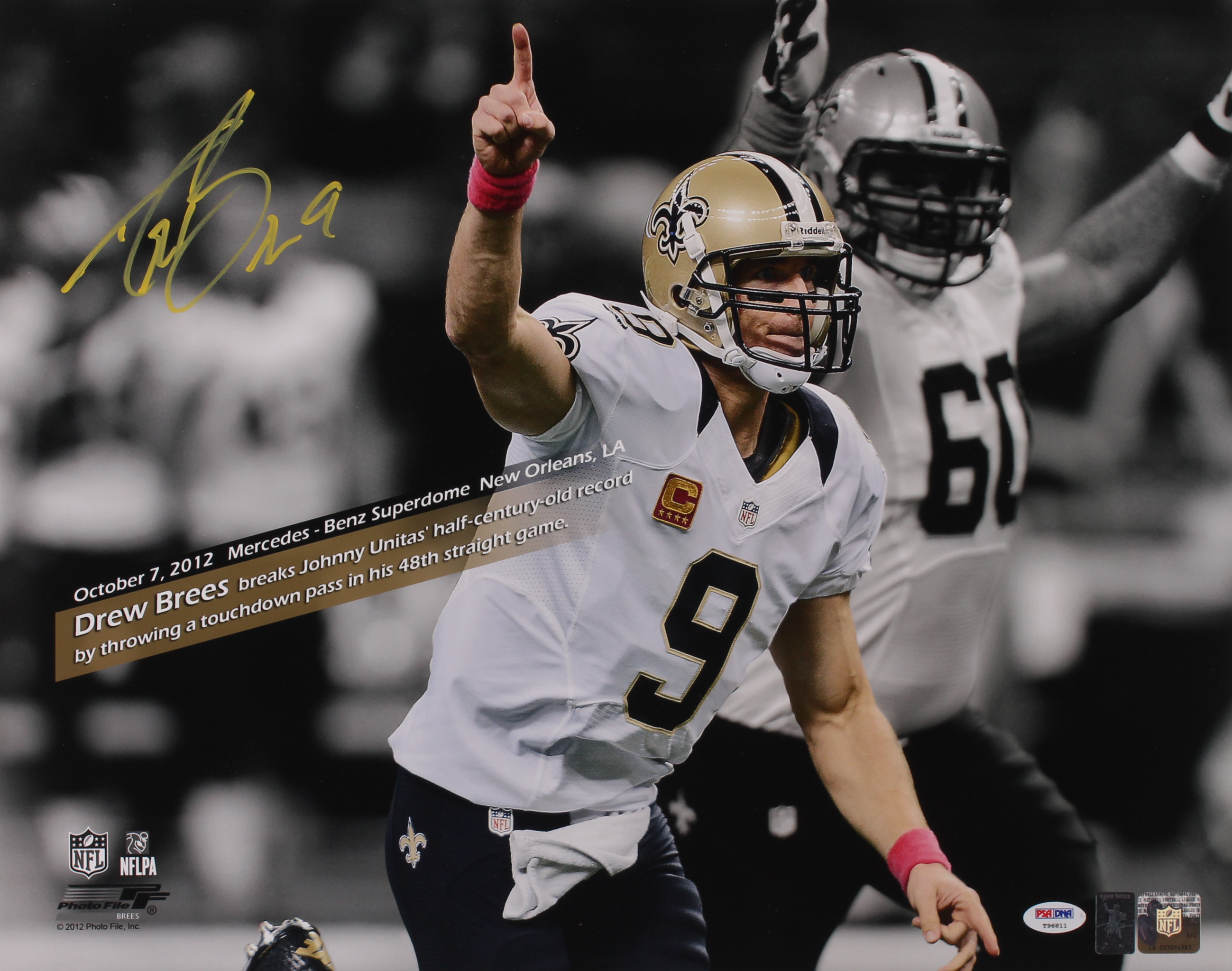 The photo measures 16" x 20" in size and has been hand-signed in yellow paint pen by Drew Brees (New Orleans Saints).