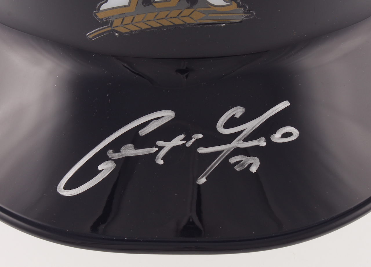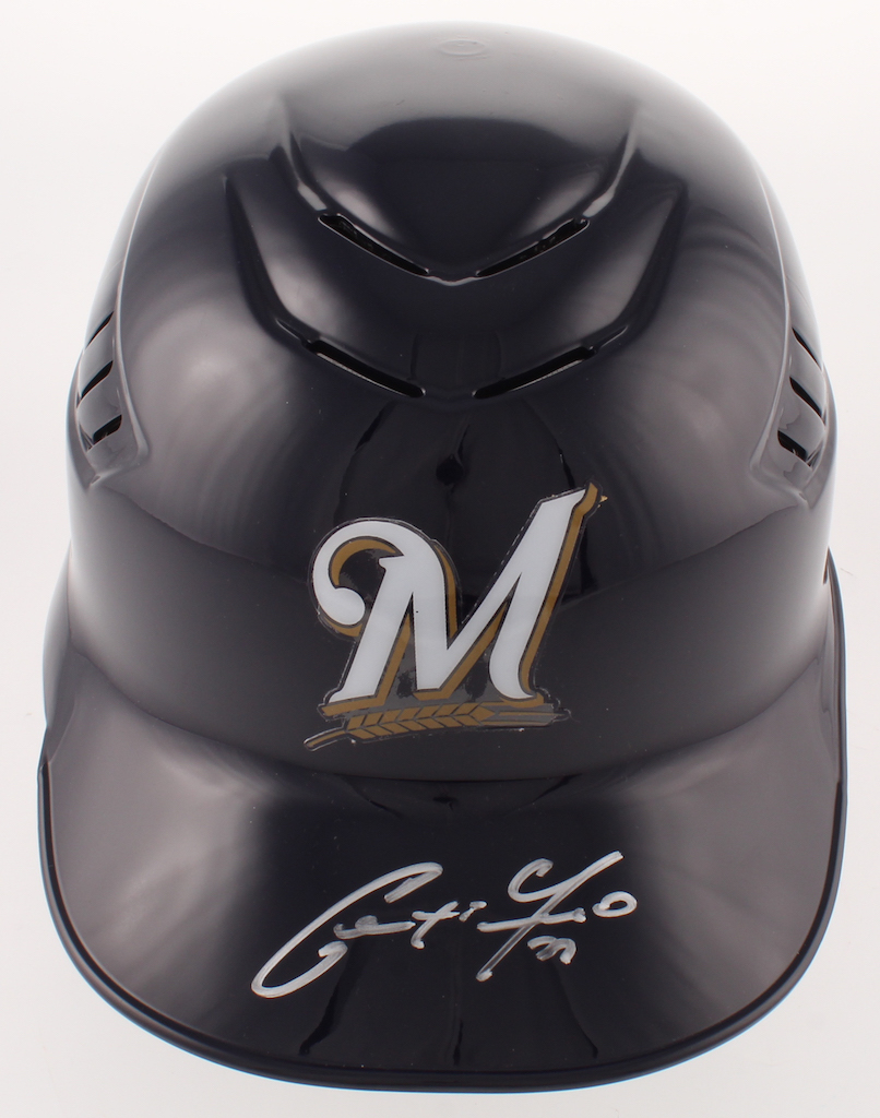 Rawlings Milwaukee Brewers replica batting helmet. Hand-signed in silver paint pen by Christian Yelich.