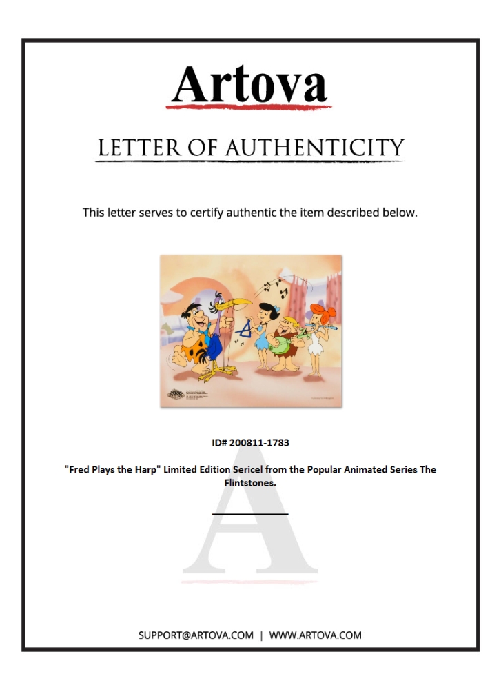 This truly wonderful collector's item from America's animation pop culture will bring cheer to fans of both past and present! "Fred Plays the Harp" is a limited edition sericel with a full color background, officially licensed by Universal Studios Licensing and Hanna-Barbera! Includes Certificate of Authenticity! Measures approx. 12.5" x 10.5" (sericel and background).