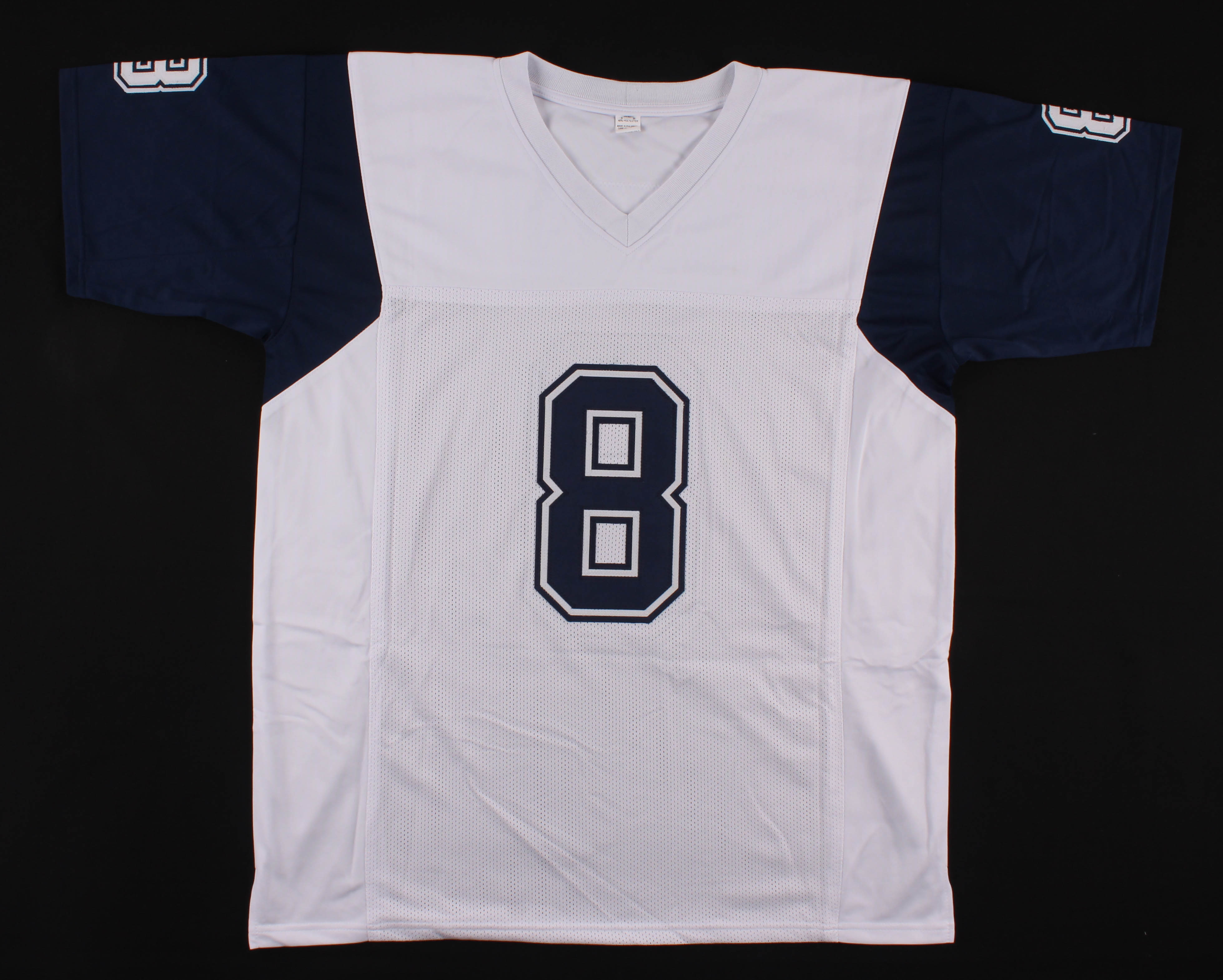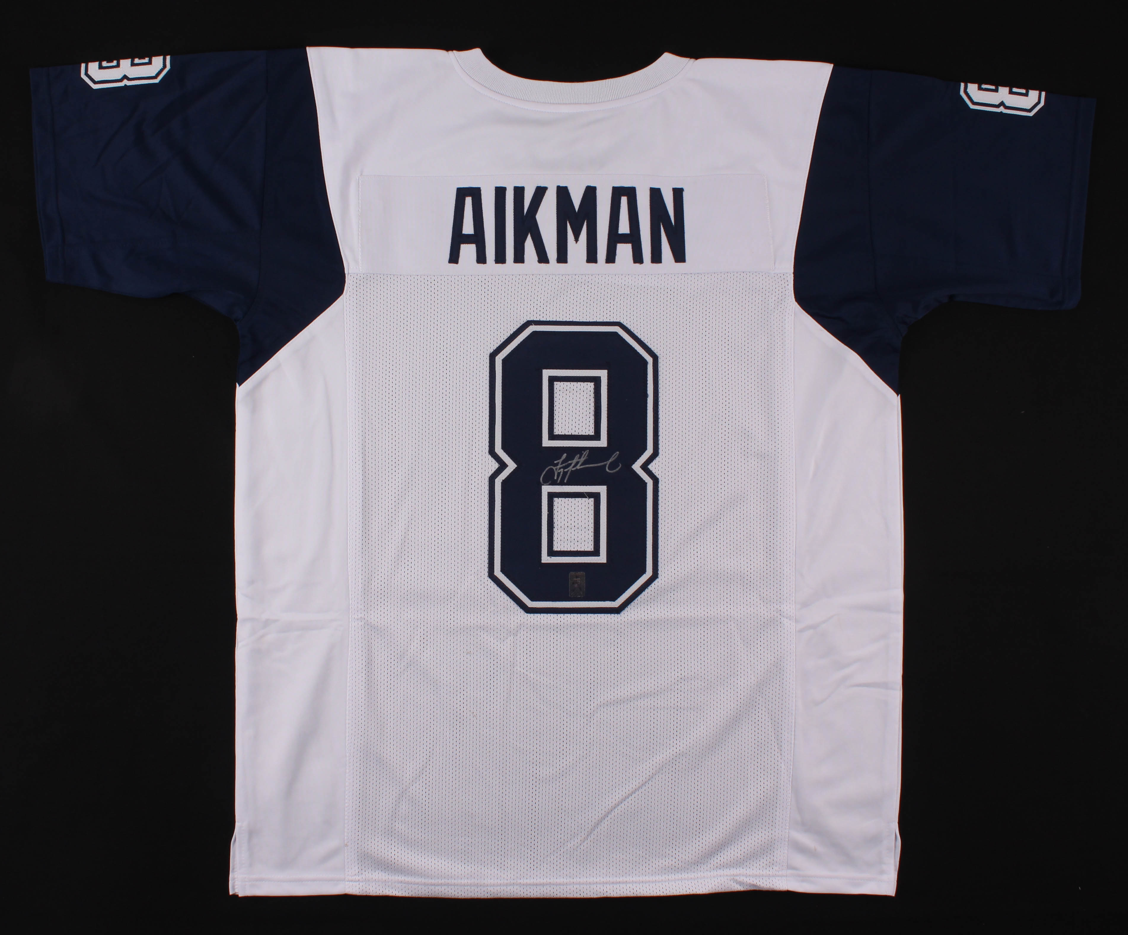 Custom on-field style jersey. Everything sewn on, size XL. Hand-signed in silver paint pen by Troy Aikman (HOF).