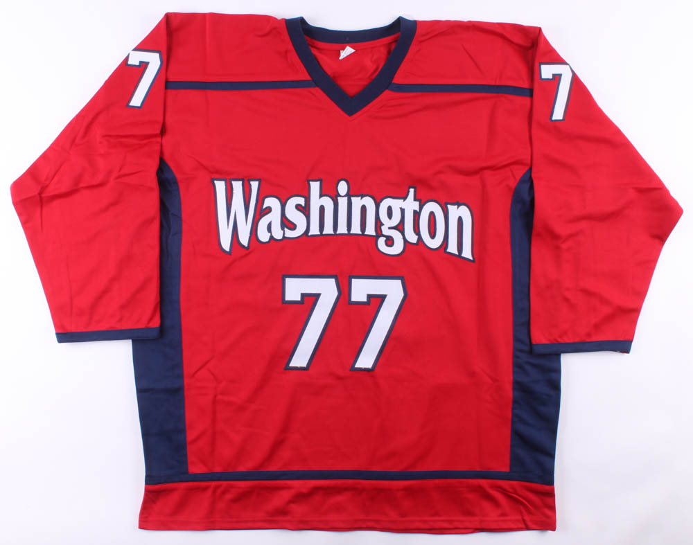 Custom on-ice style jersey. Everything is sewn on, size XL. Hand-signed in black felt-tip pen by T. J. Oshie.